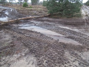 Aan het einde van de stuifwal gaan wij scherp naar rechts en lopen op de heide af, dat wil zeggen heide? De kaart geeft de kleur van heide aan. In de routebeschrijving gaat het om een kaal heideveld. Een kaal veld zou een betere omschrijving zijn. Waar is de heide gebleven? Ondergronds gegaan? Als een gelukzoeker op de vlucht naar een veilig heideveld? Wij zien het aan en begrijpen het niet. Wij volgen een breed pad (met voorzichtige bandensporen van fietsen en auto’s), totdat wij bij een plek op de zandweg komen waar van voorzichtige sporen geen sprake meer is. Een afgesloten weg gaat naar links en voor ons uit is gepoogd de weg glad te strijken. Wanneer wij naar links kijken zien wij in de verte spullen die niet op bomen lijken. Zijn het meerdere containers? Staan er auto’s en machines? Wat gebeurt daar? Volgens bordjes ligt daar een rustgebied voor wild. Wij speculeren. Wandellief vermoed dat er bos- en heidewerkzaamheden zijn. Wanneer we rechtsaf zijn geslagen op de kale heiloze vlakte schiet mij te binnen dat ik eerder op dit punt ben geweest. Soms werkt mijn geheugen. Een paar jaar geleden zag ik hetzelfde in die hoek van De Bieze. Maar daar is het raadsel niet mee opgelost. Wij lopen door tot wij bij het WildObservatiePunt (wop) aankomen. Het is een houten bank zonder rugleuning. We genieten van roggebrood en thee en het uitzicht.