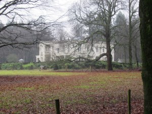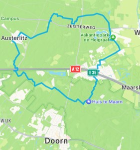 Na mijn pauze vervolg ik mijn weg door het dorp, langs de slager die mij vriendelijk groet. Ook langs een auto-opslaagplaats (o.i.d.). Gelukkig kan ik kort daarna alweer de bossen in, hoewel de bossen het mij niet gemakkelijk maken met de vele modderpaden. Ik scheer langs Landgoed Bornia. Even later ga ik de snelweg onderdoor. Bij de tunnel zijn functionerende stoplichten, omdat het verkeer van beide kanten niet tegelijk in de tunnel kan rijden. Gelukkig heb ik daar als wandelaar geen last van. Waar ik wel wat last van heb is de modderstructuur in het Mollebos. Aan de opgestapelde boomstammen te zien is hier flink gewerkt aan houtkap. De diepe sporen van het werkverkeer zijn gevuld met troebel water, daartussen houdt zich modder op. Meerdere keren zoek ik mijn toevlucht in de bermen, maar daar bevinden zich bramenstruiken. Vanuit het Mollebos kom ik aan de noordkant van Het Grote Bos, een recreatiegebied. En dan ben ik op bekend terrein. Hier liep ik onlangs ook. Bij Stamerhoef wordt gebouwd aan een huis. Landgoed Stameren bevindt zich langs de N227. Aan de overkant is weer een ander landgoed. Zo gaat het op de Utrechtse Heuvelrug maar door. Ik kom langs de zijkant en de voorkant van Huis te Maarn. Een vrouw te voet met hoed passeert over de zeer lange oprijlaan en zij is bevoegd om het bordje Verboden Toegang te negeren. Wanneer ik de oprijlaan verder afloop richting uitgang komen meerdere auto’s mij tegemoet. Ik word iedere keer vriendelijk gegroet. Op de Maarnse Grindweg sla ik linksaf en al snel rechtsaf. Vlak voor mij lopen een man en een vrouw en een hond. Plots draaien deze drie zich om en de hond wil mijn kant van de weg opgaan. Met hevig sjorren en het roepen van bevelen proberen man en vrouw de hond onder bedwang te houden. Het is de soort hond die ik liever niet tegenkom, niet in een donker steegje, niet op een bospad. Gelukkig slagen man en vrouw er in om de hond te beperken in zijn vrijheid. Ongeschonden nader ik de bebouwde kom van Maarn aan de zuidoostkant. Deze weg brengt mij langs het fraaie voormalige Raadhuis. Recht tegenover het Raadhuis staat een oorlogsmonument. Het tegelwerk voor het monument is onder water gelopen. Zo is naderen van het monument niet mogelijk. Onder de snelweg en het spoor door. Nu zijn meer mensen op de been in Maarn.