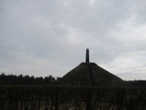 Ik ben nog steeds op hetzelfde landgoed. Langs een pad ligt een leeg bierflesje, het etiket is vergaan in de tijd. Ik passeer een smalle strook heide. In de verte loopt een vrouw met gezwinde pas. Er zijn dus toch mensen onderweg. Bij de fameuze piramide van Austerlitz slaat de regen toe. Opa en oma roepen een kleinkind, dat zich in de richting van de piramide heeft begeven. Ooit bivakkeerden hier Fransen. Ter ere van een veldslag bij dat andere Austerlitz werd hier een piramide opgericht, die in de loop der jaren vaak nabij de ondergang was. Gepoogd wordt om de passant in Franse sferen te brengen. De horeca is nu alleen op zondag open, uitsluitend met de Franse slag. Onder het afdak van het Bezoekerscentrum (op slot) trek ik mijn regenbroek aan. Het is een multifunctionele regenbroek. Hij houdt de regen buiten en de warmte binnen. Over de lange lanen dwars door de bossen kom ik aan de noordkant van het dorp Austerlitz. Regelmatig is het dorp positief in het nieuws, bijvoorbeeld door de onderlinge zorg die wordt geboden. Langs de rand zie ik huizen (vrijstaand en twee-onder-één-kap die volgens mij van recente oorsprong zijn. Wie zou zo niet willen wonen? Door een hek achter in de tuin en je bent in de bossen. Op het Dorpsplein kies ik een lunchbankje uit, terwijl de regen mij vergezelt. Ik had ook in het bushokje kunnen gaan zitten, maar ik wil de buschauffeur niet in verwarring brengen. Gaat hij dan voor mij stoppen? En zwaai ik dan enthousiast met een boterham en een kopje thee? Het eetcafé van Ouwekamp is gesloten. Op vrijdag hult Austerlitz zich in vasten. Het is tenslotte de Lijdenstijd, in voorbereiding op Goede Vrijdag, Stille Zaterdag en Paaszondag.