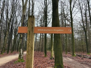 We steken de Miggelweg over, de Waterbergweg en wanneer wij de Ugchelseweg aanraken slaan wij rechtsaf. In de verte ontwaren wij een vrouw. Het is niet druk in het bos, afgezien van het allereeerste gedeelte. Een jongen met korte broek en fiets. Twee jongens met metaaldetectoren. Een vader en kinderwagen, een meisje dat met haar laarzen bladeren op een hoop schuift. Des te verder van de bebouwing van de vakantiehuisjes, des te rustiger. De vrouw is van het doorgaande zandpad afgeslagen en loopt naar het wildscherm, met de naam Ringakker. Omdat er na de tweede wereldoorlog weinig wild meer over was op de Veluwe werd besloten om hier in 1956 een Staatswildreservaat aan te leggen, de rest is geschiedenis. Zoals gebruikelijk bij deze plekken zien wij ook vandaag geen wild, zelfs niet in de wandelgangen. We wisselen een enkele groet met de vrouw bij het wildscherm. Wij kijken door meerdere gaten in het scherm. Kort daarop besluiten wij om ons niet langer op te houden op de plek waar wij worden afgeschermd van de wilde dieren (en ook vandaag dus geen wolf gezien).