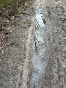 Wij wandelen naar het doorgaande pad en vervolgen onze wandeling. Bij een bank linksaf. Laat nu net op dat punt een man staan met een wolf, nee, toch niet, het is hond die, gezien zijn vacht, al deel uit maakt van de vergrijzing in ons land. De verbintenis tussen de man en de hond wordt gevormd door een lang lint. Wij komen terecht bij de Oude Beekbergegseweg. Leuk dat wij zo op een patroon van oude wegen stuiten in het bos. De bospaden zijn goed begaanbaar, op een enkele plaats ligt nog een plas op de weg. De regen die op dit koment gelukkig niet valt heeft zich al een weg naar beneden gewerkt. Op de kruising met de Ugchelseweg treffen wij hond en man wederom. Zou hier naast een kabouterpad, een wandelpad, een fietspad, een mountainbikepad ook een hondpad zijn? Een bos moet toch een beetje opgeleukt worden?! Toch? We kruisen de Waterbergweg en even verderop doen wij hetzelfde met de Koudebergweg. En dan … dan gaat het mis. We zitten niet helemaal op de route (achteraf blijkt dat ik de routebeschrijving niet goed heb gelezen). In de buurt van een paar plekken stuifzand komen wij verkeerd uit en uiteindelijk goed uit. Na het klaphek staat een wandelbankje op ons te wachten. Daar genieten wij van brood, roggebrood en thee. Pal achter ons klimt een gezelschap van drie generaties over het hek. Een boswandeling blijft een avontuur. Nog even langs de huisjes en de vakantievierders en dan zijn wij terug.