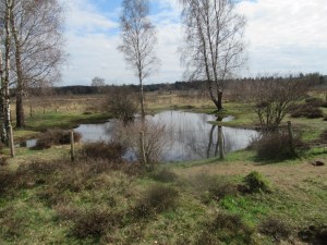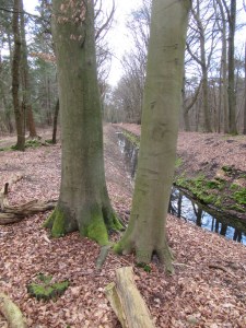 Inmiddels hebben wij een start gemaakt met onze wandeling. Van het bosgebied van het landgoed komen we bij de heide uit. Het heidegebied is aan verandering onderhevig. Meerdere wandelpaden zijjn afgesloten. Plaggen met hei zijn geplaats op het begin en einde van meerdere wandelpaden. Het tussenliggende deel van het voormalige pad is op vakkundige wijze bewerkt. Zoals op zoveel plaatsen op de Veluwe worden wandelpaden opgeheven om de natuur op vele plaatsen enige rust te geven. Er zijn ook elementen van dit gebied die niet zijn veranderd. Zo zijn er meerdere grafheuvels, deze heuvels zijn omheind door gaas, met als toetje een lijn van prikkeldraad. Het is duidelijk dat niemand hier mag komen, zelfs honden en paarden worden gewaarschuwd. Naast de grafheuvels zijn er ook urnenvelden. Het lijkt er op dat dit een grote natuurbegraafplaats is. Ook zijn er nog enkele vennetjes, door de harde ondergrond blijft het water staan. Door de overvloedige regenval van de afgelopen maanden zijn de vennetjes aardig gevuld. We gaan het bos in en nemen op gepaste wijze afscheid van de heide. Na een slingerend traject (dichtbij de Watervalweg) komen wij langs de Groevenbeek zelf, die een aardige hoeveelheid water herbergt. Meerdere bruggetjes maken het wandelaars en fietsers gemakkelijk om de beek over te steken.