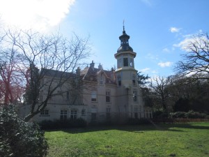 Nu komen wij bij de hoofdbebouwing van landgoed Oud-Groevenbeek. Eerst zien wij een theehuis, met een sedumdak. Achter het theehuis staat tafeltjes en stoelen en ingeklapte parasols. Binnen in het theehuis brandt een voorzichtig licht. Op een infobordje staat dat het theehuis slechts op drie dagen in de week open is en wel van 10.00 tot 17.00 uur. Wilt u thee drinken tijdens uw wandeling dan is het zaak om uw bezoek nauwkeurig te plannen, of u neemt zelf thee mee en dan hebt u ruim de tijd op iedere dag. Dan komen wij bij het kasteel, dat wil zeggen het lijkt in de verste verte niet op een kasteel. Het is een villa, maar geen ordinaire villa. De villa is gebouwd in Jugendstil. Die stijl was er nog niet in de tijden dat er kastelen werden gebouwd. Toen de villa werd gebouwd in 1908 behoorde de kastelentijd allang tot het verleden. In het jaar 1907 gaf de eigenaar van het landgoed, Jacob Hendrik van Schermbeek, de opdracht aan de Harderwijkse architecten Van Essen en Van Zeggeren. Een paar jaar later kwam er een fraaie watertoren bij. De watertoren is niet meer in gebruik als zodanig. Er is nog een prachtige kas te zien (op enige afstand). Mocht u nog verlegen zitten over een vakantieadres. Het is mogelijk om een deel of het geheel van de villa te huren.