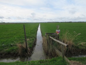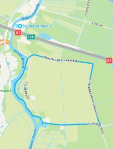 Wanneer de Eem naar links afbuigt, ga ik naar rechts, steek de dijk over, steek de/het Zuideinde over en sla de Grimmesteinseweg in. Prachtig zo’n naam. De naam Grimmestein verwijst naar een niet meer bestaand kasteel, waarvan de naamgever waarschijnlijk een grimmige ridder was, die een slechte verhouding had met zijn onderdanige buren. Om het verleden (in naam ) in stand te houden is er nog een boerderij die dezelfde opbeurende naam draagt. De Grimmesteinseweg is een lange strook asfalt, waar op ongezette tijden een auto voorbij komt. Buiten het broedseizoen kun je via een loopplank en een hekje het weiland in om er bij een andere loopplank weer uit te gaan. Omdat het momenteel broedseizoen is vervolg ik mijn tocht op de bekende weg. Links van mij stroomt het verkeer op de A1. Gelukkig komt de wind uit het zuiden, zodat het verkeer geruisloos voorbij gaat. Ik kan mij voorstellen dat bij een wind uit het noorden het wandelgenot anders wordt. Inmiddels wandel ik nog steeds over die ene weg wanneer ik langs de Achtereemlandsche Wetering (onthoud die naam!) kom. De weg gaat ongemerkt voor mij over in de Neerzeldertseweg. De naam van de Wetering verandert niet. Die verandert zelfs niet wanneer ik rechtsaf sla en mij begeef op de Slaagseweg. Ook dit is de aangepaste route wegens het broedseizoen. In stilte gaat een vrouw op fiets mij voorbij. In stilte gaat zij de Krachtwijkerweg (een fietspad) op. Langzaam gaat zij op in de leegte van de polder. Vlakbij het gemaal steek in de bekende Wetering over, die hier, volgens een bordje, de Neerzeldertse Wetering heet. Aan de andere zijde van de weg gaat de wetering verder onder de naam Wijde Wetering. Het duurt wel even voordat ik alles weet over de weteringen. De Wijde Wetering gaat naar het gemaal, maar misschien heeft de wetering daar al weer een andere naam. Wie weet? Mijn wandeling zit er op. Een mooie tijdsbesteding. Toch nog maar eens terugkomen buiten het broedseizoen en met een wind uit het zuiden.