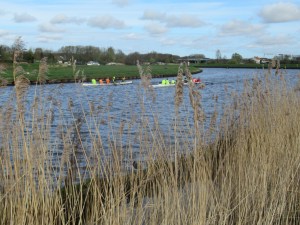 Ik ben nog maar net onderweg of ik loop bijna tegen een vogelkijkhut aan. Ik loop met aan mijn rechterhand een scherm naar de hut met vele kijkgaten. Ik kijk uit op een eilandje in de Eem. Enkele ganzen bevinden zich op de grens van water en land. Blijkbaar hebben andere vogels niet in de gaten dat ik er ben om hen te bekijken. Enige mediatraining voor deze gevleugelde vrienden zou op zijn plaats zijn. Van deze beschermde omgeving ga ik op een modderig pad vlak langs de Eem. Het is druk op dit water. Een diepgelegen Rijnaak (pardon, Eemaak) gaat voorbij en verder landinwaarts. Ik hoor het geluid van drie vrouwen die roeien met de riemen die zij hebben. Het lijkt een vaartuig voor vier (zonder stuurman). Een skiffeur met skif is al eerder voorbijgekomen. Later tref ik nog een acht met stuurvrouw en een vier met stuurvrouw. De Eem blijkt een druk bevaren rivier te zijn. Volgens de informatie is de Eem de enige rivier in Nederland die in zijn geheel in Nederland stroomt. In stilte denk ik aan de Linge. Ik passeer een verboden gebied. Het is de Wolkenberg, eigendom van Natuurmonumenten. Hoewel de naam anders doet vermoeden is er momenteel wolk noch berg te bespeuren, wel zie ik een drassig gebied, waar watervogels zich thuis zouden kunnen voelen. .