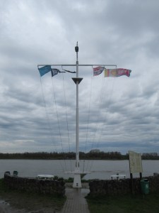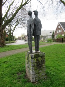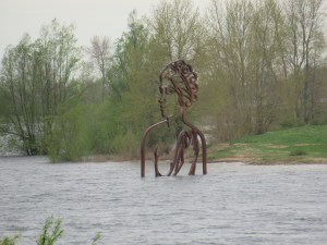 Ik vraag mij al een tijdje af of ik toch de gele markeringen van het wandelnetwerk moet volgen. Nu klop dat wel. Maar ineens klopt het niet meer. Ik ga linksaf de modderige uiterwaarden van De Bijland in. Wanneer ik omkijk zie ik de Romeinse baadster. Zal zij ooit gezelschap krijgen van een Spaanse baadster en een Franse baadster en een Duitse baadster? Ik ga een houten brug over. Aan de overzijde is een klein monument voor de omgekomen Britse vlieger C.M. Wheatley, die op Goede Vrijdag 22 maart 1940 neerstortte met zijn Spitfire. Ik ben hier bij de Geitenwaard. Op een brede tree van het trapje over het prikkeldraag naar deze Geitenwaard ga ik zitten voor mijn lunch. Gesterkt ga ik verder en kom terecht bij de plaats van een lokale traditie. Hier staat een Schietmast. Sinds 1905 schiet hier het Herwense Schuttersgilde ‘Vrede & Vriendschap’. Deze mast was tot 1989 in gebruik. Herwen heeft meer. Het staat niet alleen bekend als de gebooorteplaats van Annie M., maar tevens als een belangrijke plaats in de Romeinse bezetting van de lage landen. Veel belangrijke vondsten zijn in Herwen en omgeving gedaan en er wordt nog steeds gegraven. Infoborden wijzen de passanten hierop. Ik laat de Romeinen de Romeinen en ga verder.