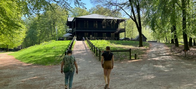We lopen eerst naar het huis zelf dat is gebouwd op de Aardmansberg. Het werd in 1861 gebouwd op last van Koning Willem III. Hier wilde hij militair overleg plegen. Vanuit deze verhoogde positie had hij zicht op een militair oefenterrein. We lopen het prachtige gebouw binnen en gaan via de brede trap naar de eerste verdieping. In een grote zaal wordt informatie gegeven over de omgeving en het huis, over opgravingen en wilde zwijnen. Een Apeldoornse fotografievereniging exposeert hier momenteel. Prachtige foto’s van de Veluwe. Wanneer ik op een glazen afscheiding leun en een kamer binnenkijk om te zien wat daar binnen zich afspeelt, komt een vrijwilliger naar mij toe, die vertelt over de geschiedenis van dit huis en wat er te zien is in deze kamer. Ik zie geweren en speren. Ik zie een houten beeld van een man met kroeshaar die een dienblad vasthoudt. Ik zie geweien. Prins Hendrik had meer met de jacht dan met het militaire leven en hij gebruikte dit pand als jachthuis. Hier kwam hij samen met zijn Nederlandse en Duitse vrienden en zij dronken op de goed verlopen jacht. Om te kunnen jagen was er veel import nodig, niet alleen de beroemde moeflon, maar ook zwijnen en herten. Wat er niet in zit kun je er ook niet uithalen. Lang na het overlijden van prins Hendrik werd het gebouw in 1972 door de toenmalige vorstin omgezet tot een voorlichtingscentrum waar de bezoekers meer te weten konden komen over natuur en wild.