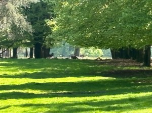 Wij dalen de trap af en tussen de gasten op het terras door zoeken wij de trap die ons van de berg afleidt. Aan het begin van het park zelf staat een betaalautomaat. €2 per volwassene. Het apparaat is echter buiten werking, althans het is niet in staat om het betaalproces op ordentelijke wijze in gang te zetten. Met gepaste vrijmoedigheid gaan wij gedrieën door het toegangshekje en beginnen wij aan de rondwandeling langs de gele paaltjes. Eerst door een bosgedeelte, dan langs een open terrein (grasland), waar meerdere bordjes bij geplaatst zijn die ons melden dat wij geen toegang hebben. We blijven uit de buurt van de toegang die er niet is. Na een kleine kilometer zien wij de wildkansel. Een flink gebouw met een groen dak. Binnenin zijn meerdere zitplaatsen en bijpassende kijksleuven. We zien uit op een groot grasveld. In mijn linkerooghoek zie ik een overdekte ruif op poten. Zou hier worden bijgevoerd? Aanvankelijk zien wij enkel mieren, die of naar rechts of naar links zich begeven. Een bijkans eindeloze stroom van kleingoed. Na enige tijd volgt een korte maar heftige mededeling van Wandellief: Dáár. Wij kijken alle drie naar daar. En? Inderdaad. Daar lopen dieren. Herten. Eerst een enkeling die naar rechts loopt, dan een andere enkeling die naar links loopt. Het lijken wel mieren. Er vormt zich uiteindelijk een klein groepje, waarvan enkelen in het gras gaan liggen. We zien de oren boven het gras uitsteken en bewegen. Een paar grote dames blijven overeind staan en lopen wat heen en weer en kijken om zich heen. Wij kijken terug. Weer mijn verrekijker vergeten, denk ik. Volgens het routeboekje is er een 90% kans op een ontmoeting met dieren (vogels niet meegerekend).