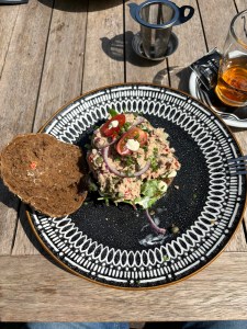 Bij de Arendsberg beklimmen wij de berg en op het terras zoeken wij een plaatsje in de zon. Er zijn niet veel lege plekken. We doen onze bestelling van cola (met citroenschijfje), cappuccino en rooibos (African orange). Daarna storten wij ons op de lunchkaart terwijl vrijgekomen tafeltjes en stoelen snel bezet worden door nieuwe gasten. Ik kies voor een wildschotel, dat wil zeggen tonijnsalade op een boskorenbol. Het smaakt prima, mede door de prachtige ambiance.
