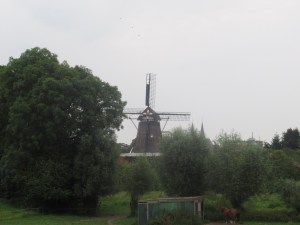 Op het terrein van De Worp is een camping, een populaire camping. Er wordt nu zelfs een deel van het park in gebruik genomen door caravanbezitters en de bezitter van een enkele tent. Lange snoeren proberen electriciteit in het onderkomen te krijgen. Zou deze drukte iets te maken hebben met de beroemde Deventer Boekenmarkt van aanstaande zaterdag en zondag? Ik slinger door het park waar ooit Kozakken bivakkeerden. Ik loop door naar de Bolwerksmolen, ga onder een weg door, over een smal bijna vergeten pad tussen bomen en struiken. Even heb ik een blik op de Bolwerksmolen (1863) maar dan ben ik de molen weer even kwijt. Wanneer ik op de grasdijk naar Steenenkamer loop zie ik de windzaagmolen weer. Een vrouw met een bordercollie loopt over de dijk. De hond wil graag voorop lopen en passeert mij op snelheid. Ik voel meerdere keren een spetter regen uit de lucht komen. Zou het gras op het Stadsland inmiddels binnen gehaald zijn?