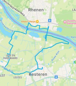 Wanneer ik de rivier over ben gestoken staan twee fietsers te wachten op de overtocht. Even landinwaarts staat een bankje waar ik ga zitten. Ik heb drinken en roggebrood bij mij. Ik heb zicht op de rivier en de gele veerboot en Rhenen. Wanneer de veerboot afvaart en de overzijde zoekt verzamelt zich een groep overvaarders. De vrouw op de boot had mij onderweg verteld dat in de ochtend weinig passagiers zich hadden gemeld. Nu schijnt de zon en zullen fietsen uit de schuur worden gehaald voor een tochtje naar verten. Inmiddels ben ik in de Marspolder en loop ik over de Remsestraat. In de bocht van de Vicarieweg staat een verlaten Tesla op de weg. Op een naastgelegen perceel bestuurt een man een landbouwmachine. Door de velden en langs kassen ga ik verder en herken dit spoor van het Batouwepad, ook een Klompenpad. Ik kom uit bij de Rosmolenweg die ik even volg, dan is er een kleine omweg langs een waterplas. Dan langs een bungalowpark. Op het punt waar de Rijndijk en de Rijnbandijk elkaar raken kies ik voor de laatste mogelijkheid. Op de dijk doe ik mijn vest uit. Het lijkt wel zomer. Aan beide zijden van de slingerende dijk is bedrijvigheid. Oude gebouwen en nieuwe. Een boerderij uit het jaar 1738 ligt tussen het groen langs de dijk. Percelen met kweek doen zich tegoed aan de zon. De Bandijk gaat de bebouwing van Kesteren binnen. Bij de vijver zijn twee jongens met hengels druk bezig. Onder een overkapping bij de vijver zitten jongelui. Op het terras van café De Uitspraak zitten mannen die de voorbije week aan zich voorbij laten gaan. Het Dorsplein bloeit op.