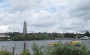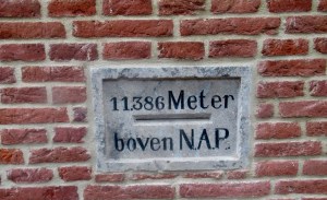 Dit is nog niet het begin van de wandeling, maar slechts een aanlooproute. Deze route gaat over de Rijnbandijk. Op de hoek van de Dijk zie ik deze steen ingemetseld in een muur. Voorlopig loop ik hier nog met droge voeten. Dwars door de speeltuin (en er naast een hertenkamp), over de straat van Frans Hals, een rotonde en dan tussen bebouwing en het buitengebied door. In het buitengebied is een klein kampement gebouwd. Aan een hoge paal wappert de vlag van Oekraïne. Ik vermoed dat hier vluchtelingen uit dit zwaar getroffen land worden opgevangen. Voorbij het Kamp ben ik helemaal in het buitengebied alhoewel de weg aan mijn linkerzijde een drukke weg is. Over de Hogeweg kom ik in de uiterwaarden. Ik zie het silhouet van Rhenen en daarbovenuit steekt de beroemde toren van de Cunerakerk. De Hogeweg is inmiddels overgegaan in de Marsdijk, die ik verder volg om vanaf de verhoging van de dijk rond te kijken.