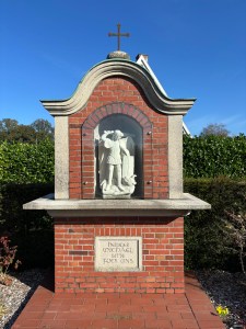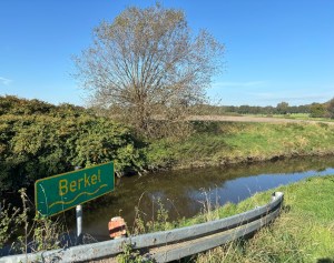 Ik drink mijn thee. Giet de smoothie in de lege drinkbus en drink het restant in de plastic fles op. De lege fles gaat in een buitenvak van mijn rugtas. Mijn weg gaat naar het zuiden. In een vork in de weg staat de heilige Michaël mij op te wachten. Hij is druk bezig met een zwaard, terwijl hij straalt in de zon. Ik laat hem achter, nu hij druk bezig is. Oldenkott nadert. Ik zie veel auto’s met een Nederlands kenteken. Wanneer ik op de doorgaande weg stuit, die rechts naar Nederland gaat, herken ik deze plek. Hier heb ik eerder gewandeld. Wanneer was dat? Hoezo? Hier gaat het Berkelpad. Deze route gaat vanaf de monding van de Berkel in de IJssel (bij Zutphen) naar de bronnen van de Berkel, een grensoverschrijdende wandeling. In september 2021 kwam ik hier langs, op weg naar het Duitse Vreden. Er is een kerk in Oldenkott, die genoemd is naar de heilige Anthonius van Padua. Ik zie een bushalte. Links op de hoek is een Gastro. Het terras is leeg. Wanneer ik er langs loop op weg naar de weg die Crosewick heet hoor ik de twee hoveniers die met het terras bezig zijn praten, in het Nederlands. Wanneer ik de Crosewick oploop wordt ik ingehaald door een tractor met Nederlands kenteken. Even ten zuiden van Oldenkott gebeurt het dan.