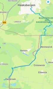 Ik steek de Berkel over en probeer herinneringen aan mijn tocht van drie jaar boven water te krijgen. Dat valt nog niet mee. Oldenkott herken ik, maar het gebied daar om heen? De Huttendijk loop ik een eindje af, dan links een smallere weg op. Een oude tractor met opa en kleindochter komt mij tegemoet. Het stel zwaait enthousiast naar mij. Al lopend kom ik bij de Achterhoek en de grens. Een tijdje wandel ik over de grens, soms over een smal pad door een houtwal, die dan weer breed is, dan weer smal is. Omdat het volgende tien-kilometer-punt dicht bij mijn einddoel van vandaag ligt, zal ik maar doorlopen. Telkens weer op de grens. Naar het westen, dan naar het zuiden. Grenssteen na grenssteen. Dichterbij Zwilbroek wordt het lopen op de schouwpaden lastig. Er is niet lang geleden gebaggerd en de restanten zijn te merken onder mijn vgoeten. Sporen van het voertuig zijn helder zichbaar in de ondergrond. Modder. Takken. Grassen. Ik moet opletten dat ik niet struikel. De Veengoot zorgt op dit moment zo voor enig ongemak. Wanneer ik in Zwilbroek (of Zwillbrock) aankom wordt het tijd om te kijken naar vervoer. Ik kom er achter dat ik beter een tijdje terug had kunnen bellen voor vervoer naar het treinstation van Lievelde. Een uur van tevoren bellen! Ik maak een afspreek met de haltetaxi (RRReis) en loop naar de plaats waar ik zal worden opgepikt. Ruim 800 meter wandelen langs een drukke weg. De plaats waar ik sta te wachten ligt naast de camping Goede Hoop. Ik krijg berichten na een uur hoe lang het nog duurt. Gelukkig regent het niet. Wanneer de electrische VW (met de letters ZOOV) voor komt rijden is mijn probleem opgelost. Ik krijg van de chauffeur nog wat hoogtepunten van de reis uitgelegd, zoals het Olie B. Bommelpark in aanbouw. In Lievelde staat de trein naar Zutphen klaar, daar stap ik over op de trein naar Apeldoorn en zo verder. Het zijn twee mooie dagen geweest.