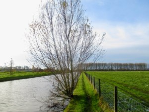 Bij de ingang van het parkeerterrein met als toegangsbord de informatie over het Klompenpad zet Wandellief mij uit de auto. Zij gaat naar haar zus in Culemborg. Ik ga het Klompenpad Goilberdingenpad lopen. We hebben een hectische reis achter de rug met files en omwegen. Het startpunt ligt bij fort Werk aan het Spoel. Dit is niet een opleiding voor wevers van kostbare textielen, maar een onderdeel van een Waterlinie. Hier wordt Holland verdedigd tegen indringers. Ik zal onderweg vele sporen van verdediging tegenkomen. Ik ga van start op het Schootsveld, de naam zegt het al. Kom niet in het schootsveld, maar hier kan het wel. Ik hoop dat iedereen zijn kruit al heeft verschoten. Zonder ongelukken loop ik langs de weidse parkeerplaats en ga naar het zuiden. Hier zie ik meerdere restanten (waaronder een kogelvanger) van de Waterlinie. Doelloos in het landschap. Aan het einde van het pad kom ik aan bij de Prijsseweg die ik linksaf op ga. Ik passeer de Witte Schuur waar ik kerstpakketten kan kopen. Aan één pakket kom ik al niet toe. Direkt na deze schuur gaat de route rechtsaf. Het is een smal pad en een glibberig pad. Aan mijn rechterhand een hek met draden. Het spoor dat middenop het pad zijn gang gaat loopt schuinop richting draad. Op zeer korte afstand ligt aan mijn linkerhand een brede sloot (zonder naam ?), daarachter ligt een nieuwbouwwijk van Culemborg. Een hardloper aan de overzijde gaat haar eigen gang. Ik loop geconcentreerd over het smalle pad. Aan het einde kom ik in een bosstrook en gaat het rechtsaf. Hier loop ik langs de Prijsche Wetering. Het pad is bij tijden moeilijk begaanbaar, maar uiteindelijk kom ik uit op de Zoowijkseweg. Ik kan rechtdoor, maar dat is de verkorter. De hoofdroute gaat linksaf. Dan kom ik op de Stokvisweg, maar zo koud kan het nu toch niet zijn?! Over een smal en besneeuwd bruggetje gaat de route door grasland, dat niet recentelijk is gemaaid. De route gaat om de Zandput heen. Hier zou een speelveld De Tuinpiraat moeten zijn, maar mij valt niets op. Misschien is dit gehele gebied wel speelgebied. Piraat of niet. Mijn aandacht gaat uit naar de glibberpaden. op het terrein dat vlakbij een provinciale weg ligt. En onder gehoorsafstand van de snelweg A2.