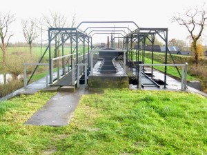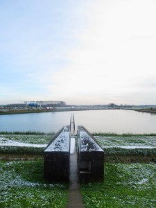 De lus van de bunker is deels heen-en-weer. Terug naar de gespleten bunker die een mooie pauzeplek is. Ik ga binnen zitten. Met zicht naar links en rechts en boven. Over de snelweg, over de V-trap naar beneden de polder in, door nat grasland en dan terug op een tentakel van de Stokvisweg en dan brengt de hoofdlijn van de Stokvisweg mij naar de Diefdijk. De Diefdijk ligt recht in het landschap. Links beneden liggen boerderijen en woonhuizen, rechts beneden ligt akkerland. Langs de weg een kraampje met pakjes hooi en snuisterijen voor de kerst. Tegen betaling mee te nemen. Op een kruising kan ik rechtdoor de Diefdijk vervolgen tot aan Fort Everdingen. Rechtsaf kan ik naar de Witte Schuur, maar ik ben nog steeds niet van plan om een kerstpakket te bestellen. Linksaf kan ik de Lange Meent op. Dat spreekt mij aan. Maar al snel sla ik af om op een doodlopende weg (een weggetje? een paadje?) te komen die zich siert met de naam Korte Meent. Wat hier aan de rechterkant van de Korte Meent staat is een aangeregen verrassing van huizen en huisjes en kassen en kasjes en opbergschuren en opbergschuurtjes. Zelfs tref ik hier een Stress Free Zone aan. Links van het pad staat een bord dat er duidt dat hier alleen voetgangers thuishoren, maar de strook ongeregeld vastgoed gaat nog iets verder. Meent is een gemeenschappelijke weide en het zou kunnen dat zowel de Korte als de Lange Meent een grens van de gezamenlijke meent vormden. De Korte Meent komt uit op de Lekdijk. Vlak voordat Everdingen opdruikt aan de kant van de dijk ga ik de Everdingerwaard in. Kan ik hier met droge voeten verder. Het blijkt allemaal mee te vallen, behalve de modder in deze uiterwaard. Het is stil en verlaten, zelfs vaart er geen schip voorbij. Is het pauze? Bij de inlaatsluis van Fort Everdingen sla ik af naar het zuiden. Linksaf gaat het pad naar een voetveer (dat nu niet vaart, zelfs geen voet ver). Rechtdoor is ook mogelijk, maar ik ga linksaf langs de waterverbinding tussen de Lek en Fort Everdingen. Vlakbij Fort Everdingen probeer de dijk naar de Noodweg op te komen. Daar heb ik enkele pogingen voor nodig, want de modder geeft mij onvoldoende vastigheid onder mijn geprofielzoolde wandelschoenen. Uiteindelijk boven aangekomen kan ik mijn handen schoonmaken. Het is ook hier stil en verlaten totdat een auto het terrein komt oprijden. De horecagelegenheid Fort Brouwerij is gesloten. Geen koffie. Geen thee. Geen appelgebak. Geen frisdrank. Ik dwaal over het terrein (dat ligt in Utrecht en Gelderland) waar ook een camping is waar een eenzame camper staat. Via een bijzondere loopbrug over een sluis (?) ga ik uiteindelijk terug naar de Lek maar nu in de uiterwaard Goilbedingen.Uiteindelijk kom ik terug bij Fort Werk aan het Spoel. Daar houdt Caatje open huis aan de Lek. Een gezellige horecagelegenheid. Ik kan buiten mijn wandelschoenen schoon borstelen met een constructie waar drie bezems in passen, zo kan ik met een gerust hart en redelijk schoene schoenen naar binnen. Ik bestel een chai latte en een handjevol bitterballen en wacht op Wandellief.
