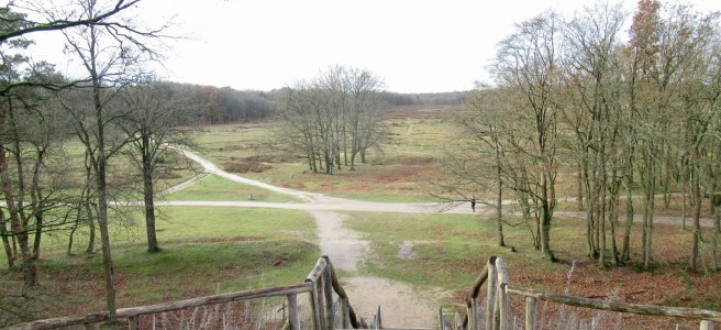 Het wordt tijd om de bebouwde kom te verlaten. Langs een camperplaats (met twee campers) gaan ik het groen in. Bospaden met af en toe een blik op de voormalige Zuiderzee. Het is hier een Natura2000 gebied, waar ik niet de enige wandelaar ben. Wanneer ik een man met hond passeer wenst hij mij een goede wandeling. Hijzelf heeft ooit het Pieterpad gewandeld, maar met zijn nieuwe knie ziet hij lange wandelingen niet meer zitten. Nu maakt hij zijn dagelijkse ommetje met de hond. Ik kom over twee hoogten in het landschap. De eerste hoogte is de Aalberg (die op de top 9 meter boven NAP ligt), dan volgt al spoedig de Eukenberg, die tot grote hoogte stijgt. Er zijn uitgestrekte treden aangelegd en voor de wankelen onder ons zijn er zelfs leuningen. Hoe hoog moet het hier wel niet zijn? Bovenaan sta ik op 14 meter boven NAP. De Utrechtse Heuvelrug laat zich voelen en merken. De kop is er af. En dan te bedenken dat dit een kunstmatige heuvel is, die diende als vuurberg en bakenberg voor de scheepvaart op de woeste wateren van de Zuiderzee. Het is opvallend hoeveel verlatenheid en uitgestrektheid te vinden is in deze Gooise buurt. Ik kom over de Limitische heide, de Nieuw Bussemerheide, een flink heidegebied bij Bikbergen. Vervolgens ligt daar de Tafelbergheide. Ook weer een uitgestrekt heidegebied. De zon schijnt uitbundig en doet de kilte verdwijnen. Een wandelaarster zit op een bankje met haar rugzak en thermoskan. De mobiel ligt aan de oplader. Het is duidelijk dat zij geen rondje om de Tafelberg loopt.
