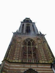 CunerakerkVan Kwintelooyen zet ik langzaam maar zeker de afdaling in door de bossen, over de Paasheuvel, door de Rhenese stadsbossen, over landgoed De Tangh (waar ik netjes gevraagd wordt om gegevens over de bij en de libelle door te geven vanwege biodiversiteitsonderzoek). Elk reepje groen wordt gebruikt om dieper Rhenen binnen te dringen. Hier heet de wijk Molenberg, met een oude watertoren met ingebouwde appartementen. Uiteraard mag de Cunerakerk niet ontbreken op de route. Hier werd al in de Middeleeuwen de heilige Cunera vereerd. De route komt door een oud deel van de stad en blijft aan de zuidkant zodat ik zicht heb op de Nederrijn en op de brug over deze rivier. Het regent nog steeds flink. Ik ga over de Schoutenboomgaardweg, om verrvolgens de Cuneraweg op te gaan waar ik aan mijn linkerhand goed bewaarde mooie oude rijtsjeswoningen aantref. Op het balkon zullen de bewoners mooi uitzicht op het rivierlandschap hebben. Een vrouw te voet komt mij tegemoet. Zij draagt haar paraplu schuin zodat zij beschermd is tegen regen en wind. Echter, het zicht ontbreekt haar. Oppassen dat wij niet tegen elkaar oplopen. Gelukkig heeft zij het op tijd in de gaten. We praten even en zij wenst mij een goede wandeling toe. Ik heb nog ongeveer drie kilometer te gaan.