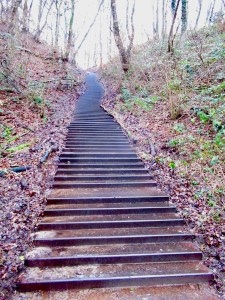 De brug naar de Betuwe ga ik onderdoor en de Cuneraweg verlaat ik om de Vogelbuurt in te gaan. Zo te zien een vrij nieuwe wijk waar zelf een wadi niet aan ontbreekt. Het pad gaat langs de noordkant van de Grebbeplas. Deze naam wijst er op dat de Grebbeberg niet ver weg is. Een steil pad wijst de weg naar het hooggelegen bos. Hier ben ik op de berg. De Grebbeberg leeft voort in het collectieve geheugen als de plek waar zwaar werd gevochten aan het begin van de Tweede Wereldoorlog. Er is dan ook op flanken van de berg een Erebegraafplaats. Ik ga de kant uit van de rivier. Ik blijf op hoogte zodat ik mooie uitzichten heb, zelfs met dit weer. Nog aan deze kant van de rivier ligt het natuurgebied de Blauwe Kamer waar het ook goed wandelen is, tenzij de rivier een hoge waterstand kent. Ik passseer Koningstafel waar volgens de verhalen vorsten van allerlei rang en stand aten (na een jachtpartij?) om tegelijk te kunnen genieten van de uitzichten. Vlakbij is een mooi uitkijkplatform. In dit bos zijn veel trappen van cortenstaal aangelegd. Met een van deze trappen maak ik de lange afdaling naar een fietspad dat mij naar de Grebbesluis brengt. Bij de oprit naar Villa Grebbeoord staat Wandellief mij op te wachten. Ik leg mijn natte spullen in de achterbak en stap de warme auto in.