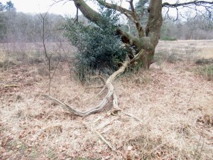 Op een kronkelende wijze gaat de route naar de heide ten noorden van het landgoed. Dit heidegebied heet – niet verrassend – Groevenbeekse Heide. Op de heide en aan de randen zijn meerdere grafheuvels te bemerken. Aan de zuidkant van de bebouwde kom van Ermelo kom ik bij de druke Putterweg. Gelukkig is hier een fiets-en wandelschoentunnel aangelegd zodat ik zonder schade de andere zijde van de weg kan bereiken. Hier kom ik in de gemeentebossen van Ermelo en wel in het Ruigeveld. De ruigte valt wel mee want er zijn keurige wandelpaden en nauwelijks wandelaars. Ik kom uiteindelijk terecht bij de Schapenrotonde. Vanaf hier ga ik dwars door de bebouwde kom van Ermelo, over de Hamburgerlaan, waar geen eettentje is te vinden, via woonwijken, langs kerkgebouwen, door het kooplustige centrum, langs de weekmarkt waar mensen een visje halen. Dan kom ik bij het station. De wachtruimte met horecagelegenheid en minibieb (!) is nu geheel veranderd in een café. Ik ga zitten op een bank op het perron. Treinen komen en gaan en ik wacht op mijn volgende wandeling.