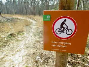 Vlakbij de snelweg kom ik uit bij het Vennenpad, dat een asfaltweg blijkt te zijn. Gemotoriseerd verkeer kan hier oversteken en een plek in de bossen zoeken. Er zijn parkeerplaatsen en er is een asfaltweg. Na een woning in het groen sla ik rechtsaf en verdwijn dieper in de bossen. Deze wandeling is een echte boswandeling. Uitgebreid worden paden en paadjes opgezocht in het Zandenbos. Langs de plek waar ooit het beroemde oftewel beruchte Ronde Huis stond kom ik niet. Niet erg, daar ben ik wel eens bij een andere wandeling geweest. Kort na de oversteek van de snelweg kwam ik aardig wat wandelaars tegen, maar hoe dieper ik de bossen in ga hoe stiller het wordt. Ik heb er geen bezwaar tegen. Borden geven aan waar ik wel en niet mag komen. Dat geldt ook voor fietsende medeburgers. Volgens het bord mag je hier ook niet meet de fiets aan de hand komen. De bandensporen in het zand wijzen op een andere werkelijkheid. Of zou je hier soms wel met één fiets mogen komen, maar niet met twee fietsen?