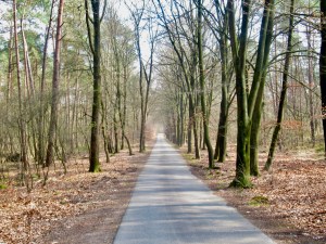 De wandeling gaat van west naar oost en dan weerom. Een heel mooi traject is daar waar ik op een smal pad over de zandruggen loop. Soms is het kruip door sluip door. Zo waar zijn er hier zelfs hoogteverschillen, gelukkig krijg ik geen last van hoogtevrees. Een paar kilometer voor het einde van mijn tocht ga ik zitten in de berm van een smal pad. Het wachten op een zitbankje is tevergeefs gebleken. Tijd om te lunchen. Dan hoor ik plots geluiden. Er komt een stoet mountainbikers aan vanaf de heuvelrand. Ik trek mijn benen in, want deze groep scholieren gaat met hoge snelheid naar beneden en weet niet zo goed het rechte pad te bewaren. Sommigen dreigen van het padje te geraken. Na een korte rust komt de volgende groep. Deze doet het voorzichtiger aan en kiest een beter spoor. Mijn tenen zijn nu niet in gevaar. Nog even wachten en dan ga ik in de richting waar de bikers vandaan zijn gekomen. Er is geen volgende groep. Boom na boom. Vogels fluiten. Pad na pad. Verder maar weer. De snelweg over en via een ander pad naar het Bezoekerscentrum dat nog steeds dicht is, want het dinsdag. Bij de hoge toren zie ik een vrouw een hek opzij schuiven om de toren te kunnen beklimmen. De man blijft beneden staan. Ik doe een poging om de toren in te gaan. Halverwege houd ik het voor gezien. Ik heb genoeg gezien, bijvoorbeeld een deel van de werkzaamheden bij het spoor. Er is al een tunnel onder de perrons door. En een tunnel waar de oude weg lag. Onderaan de toren vertelt de achtergebleven man mij in het Duits dat zijn vrouw daar boven is. Gelukkig is hij zijn vrouw nog niet uit het oog verloren.