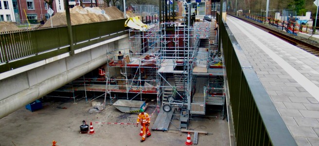 Na familiebezoek in Nunspeet heeft Wandellief (dit keer vermomd als Autolief) mij afgezet op de transferiumparkeerplaats ten zuiden van station Nunspeet. Een deel van de parkeerplaats is afgezet en in gebruik genomen door de werkers aan de spoortunnels die voor een betere doorstroming moeten zorgen. Ik ga op pad met mijn vijfde wandeling uit het Boekje van Bart.