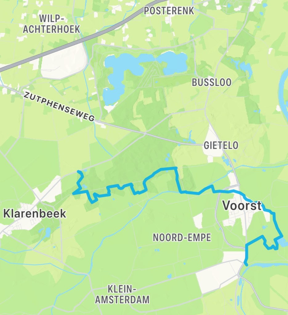 Ik ga op weg naar Voorst. De naamgever van de gemeente. Over een mooi traject kom ik langs de Voorsterbeek die zich wentelt door het vlakke land. Ik passeer boerderij de Kolke, met kampeerterrein en een landgoedwinkel. De geschiedenis van deze boerderij gaat terug tot 1405. Sins 1924 boert hier de familie Wassink. Er wordt gewezen op de mogelijkheid om ijs te kopen, maar ik weet mij succesvol te ontworstelen aan deze verleiding en loop de rondweg van Voorst onderdoor. Hier ben ik op de Klarenbeekseweg. In een weiland wordt heen en weer gereden met machines. Een paar huizen staan te koop. Verder is het rustig. Dan de Wilhelminaweg op die uitloopt op de Olde Wheme, de oude pastorie van de hervormde gemeente van Voorst. Ooit woonde hier de befaamde theoloog en hoogleraar Miskotte, die zich bij zijn emeritering hier vestigde (1959-1976) en verder las en studeerde en schreef. Vergis ik mij of heeft de tuin recent een drastische verandering ondergaan? Langs de gesteigerde kerk kom ik op het Kerkepad. Zouden er nog kerkgangers zijn die hier over lopen? De Protestantse Gemeente hier is samen met die van Wilp en van Klarenbeek. De kerkdiensten rouleren tussen deze drie plaatsen. Verder zijn er twee predikanten en een kerkelijk werker. Ik loop verder over het pad dat door het groen en langs heggen loopt. In de verte zie ik Zuphen.