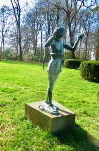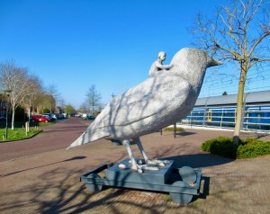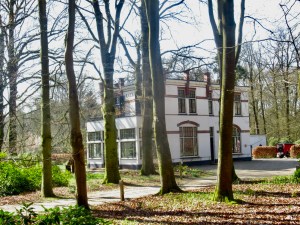 Vandaag begin ik aan een lijnwandeling langs stations. Twaalf etappes lang en vandaag hoop ik twee etappes te wandelen. Ik ga te voet over paden en niet door de lucht op de rug van een grote vogel. Hoe uitnodigend de grote vogel mij ook aankijkt bij het verlaten van het station. De weg gaat eerst door het uitgestrekte winkelcentrum van het dorp. Winkel na winkel en niet te vergeten her en der horeca. Dan komt een gedeelte langs de Twellosebeek waar het groen is. Ik zie scholieren en overstekende dames en mannen die een hond uitlaten. Twello leeft. Het weer is prachtig en belooft in de loop van de dag steeds warmer te vinden. Voorlopig houd ik mijn jas aan want de wind is nog koud. Ter hoogte van Steltenberg verlaat ik de beek. Er staat een mooi monumentaal gepleisterd huis op Steltenberg. Er is ook nog een koetshuis tevens dienstwoning. De woning dateert rond 1860 en heeft meerdere eigenaren gekend. Mensen uit de buurt en van verder weg. Het toegangshek zit dicht. Net buiten het hek laat een vrouw haar hond aan. Zij kijkt mij aan wanneer ik door het hek de tuin inkijk. Alles wordt in Twello waargenomen.