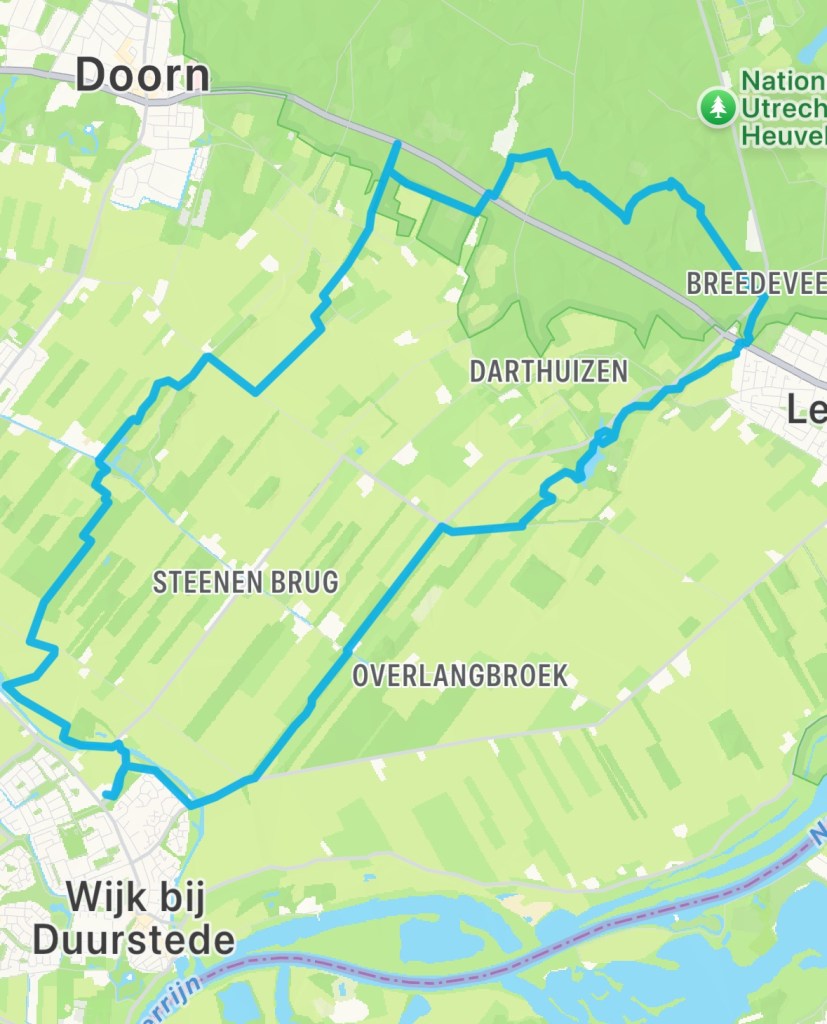 Wij lopen de Buntlaan af, met enkele bochten, veel bomen en veel rust en veel vogels. Er is bijna niemand te bekennen wanneer we genietend verder gaan, totdat wij plots stuiten op de Leersumsestraatweg. De route wijst ons naar de overkant van deze weg tussen Leersum (naar het oosten) en Doorn (naar het westen. Wegwerkers zijn druk bezig en één man houdt alles wat Buntklaan op hem af komt tegen, want er is net een nieuwe laag van ‘iets’ op de weg gelegd. Hij wijst ons een andere weg, zodat we op een ander punt onze grote oversteek kunnen maken. We gaan terug en gaan de Postweg op. We passeren caravanterrein ‘de heihoek‘, waar we wel caravans zien, maar geen mens. Via de Hoolweg kunnen we de afgesloten weg oversteken. Langs ‘Bonte Vlucht gaan we de bossen verder door en houden de oostelijke richting aan. Ook hier heerst grote rust. We lopen hier in de Kaapse Bossen. Met een flinke afdaling komen we uit bij de drukke Maarsbergerweg, die wij oversteken. Dan door het bos evenwijdig aan deze weg en dan komen we uit bij de Rijksstraatweg die door Leersum loopt. Aan de overzijde van de weg is restaurant Darthuizen en het terras is nog open tot vier uur. Dan hebben we nog tijd voor drinken en een paar bitterballen. Na deze noodzakelijke stop gaan wij verder en wijken we iets van de route af door het smalle pad te kiezen dat uitkomt bij de oprijlaan van Parc Broekhuizen. De bomen langs deze oprijlaan (waar je van deze kant niet op kunt rijden) hebben we een zwaar leven. Een flink aantal bomen heeft de grens van leven naar dood overschreden. De route gaat over mooie paden en lanen van het Parc. In de buurt van gebouwen zijn nog mensen waar te nemen, maar verderop is het al weer stil. We lopen over een terrein van landgoed Den Treek Henschoten (dat ik hier niet had verwacht). Dan komen we uit op de Gooyerdijk. Dan de Broekhuizerstraat, die weinig weg heeft van een straat. Het graspad wordt nauwer en nauwer en de vogel fluiten om ons te begeleiden. Op de Langbroekerdijk besluiten we om de route van het Gerrit Achterbergpad te volgen door het essenhakhout. Misschien liep Gerrit hier wel op weg naar school in Wijk bij Duurstede. Via de Amerongerwetering en de Nieuweweg komen we op een fraaie groenstrook tussen de bebouwing en de Kromme Rijn. Kinderen spelen in de rivier, zelfs een burka verhindert dat niet. Dan zijn we terug bij de volkstuinen en de parkeerplaats bij de grutter.