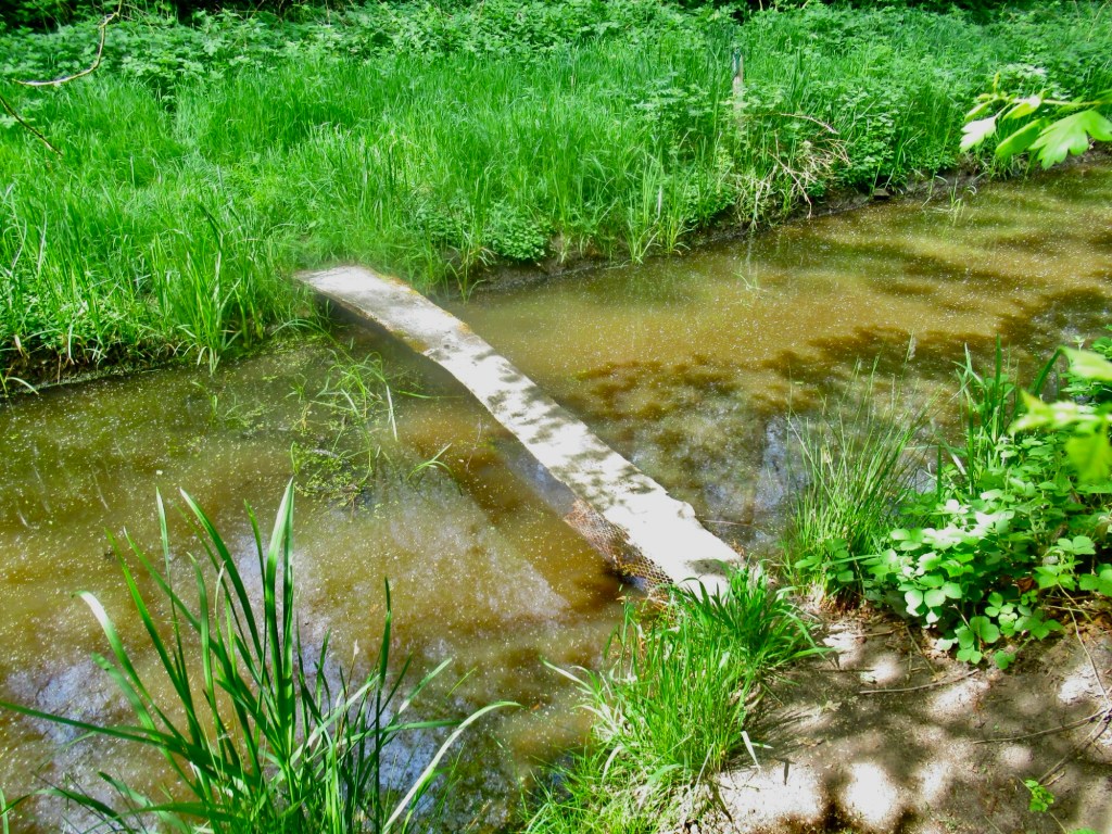 De route begint keurig netjes bij een bushalte aan de voet van de imposante Donderberg, aan de westzijde van Leersum. Aangezien wij vanuit de bloeiende Betuwe komen beginnen wij in Wijk bij Duurstede en wel aan de noordzijde, op het parkeerterrein van een grutter. Niet iedereen heeft de groenten van deze grutter nodig, want in de directe omgeving zijn meerdere volkstuinen en zelfs De Wijkse Moestuin. Wanneer wij de bebouwing uit zijn, de Kromme Rijn zijn overgestoken en in bosstroken en struikgewassen komen van het Vikingbos valt direct op dat de vogels een fantastische dag hebben. Onophoudelijk laten onze gevleugelde vrienden van zich horen. Een heel orkest is bezig. Het is dan ook een pracht dag met veel zonneschijn. Wie wil dan niet van zich laten horen?! Bij de Groenewoudseweg laten we voorlopig de Kromme Rijn achter ons. Wat opvalt is dat er wel veel vogels zijn, maar nauwelijks wandelaars. Op de Landscheidingsweg slaan wij linksaf en dan in een lichte knik in de weg gaan we het asfalt af om een graspad naar de bossen te volgen. In deze bossen klinkt weer het vogelorkest. Langs een sloot kunnen wij niet verder, een bord wijst ons daar op. De enige uitweg is nu om de sloot over de trekken middels een sierlijke brug, bestaande uit een lange plank. Omdat ik de jeugd graag voorrang verleen laat ik Henk eerst de plank over gaan. Het gaat boven verwachting goed. Nu kan ik ook verder gaan.