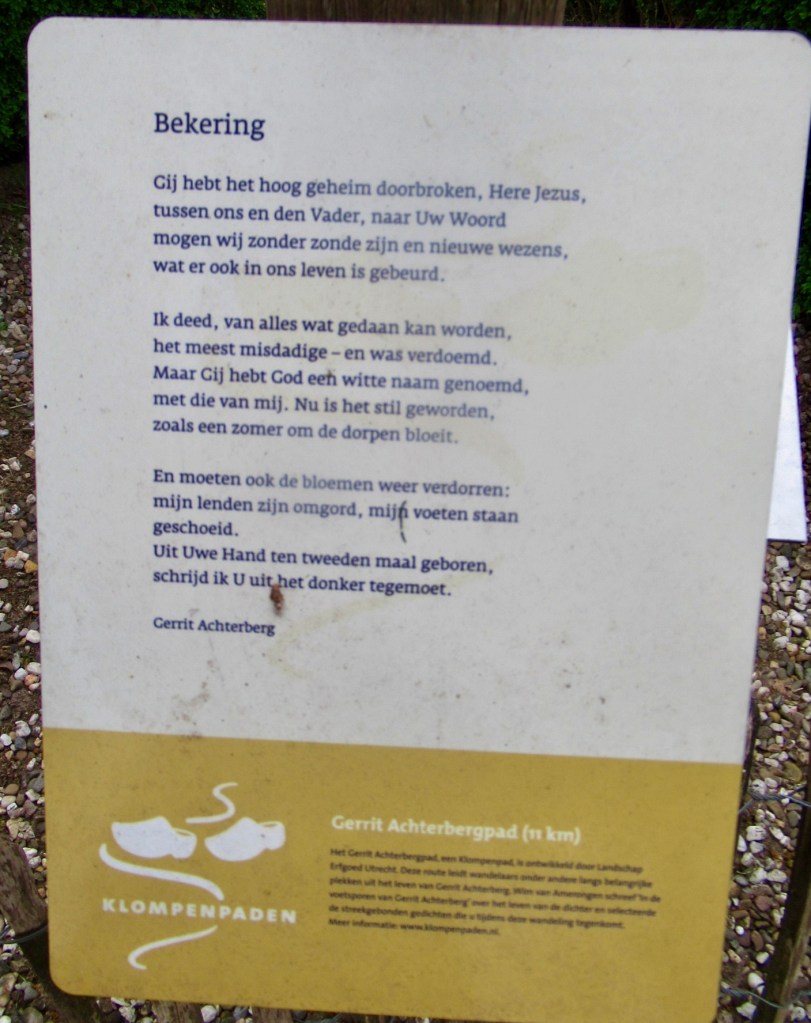 We lopen inmiddels al even op het landgoed Sandenburg. Vanaf de Langbroekerdijk hebben wij goed zicht op het Huis. Onlosmakelijk verbonden aan dit landgoed is de dichter Gerrit Achterberg (1905-1962). Hij werd geboren in de koetsierswoning achter de Oranjerie, want zijn vader was hier koetsier/chauffeur en later pachtboer. Het is dan ook zeer passend dat in deze omgeving een Klompenpad is gerealiseerd ter ere van deze grote dichter en getroubleerd mens. Op meerdere plekken treffen we gedichten van Achterberg aan. Op het landgoed gaan wij verder naar het noorden over stille paden en dan een kort gedeelte over de Sandenburgerlaan. Dan rechtsaf de Gooyerlaan op. Daar zijn mensen bezig om nieuwe bomen te planten langs de weg. We kunnen nog wel een paar bomen extra gebruiken in ons land. Wanneer we bij de onverharde Buntelaan aankomen staan we even stil bij de boerderij die hier staat. De naam is ‘Het Boompje‘, een boerderij die al eeuwen verbonden is aan de familie van Gerrit Achterberg. Zijn betovergroootvader kwam hier te boeren, op een voorganger van de huidige boerderij. Zowel de overgrootvader als de grootvader van Gerrit werden hier geboren. Toen Gerrits vader een keer op familiebezoek was op deze boerderij leerde hij zijn latere vrouw kennen, die daar werkte als meid.