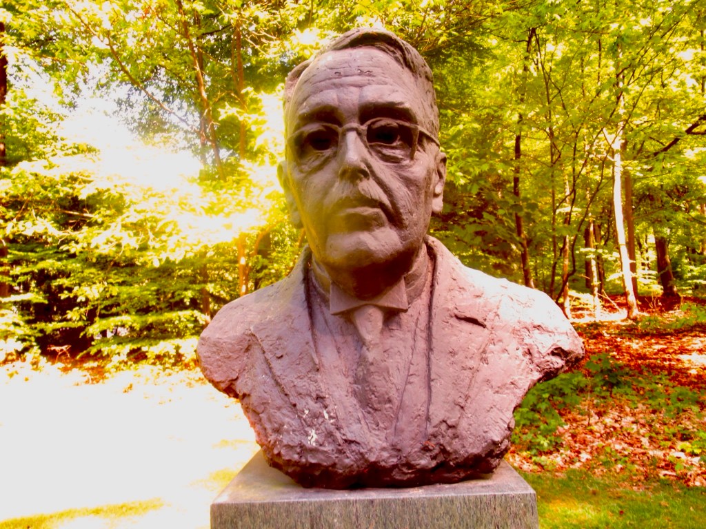 Ik steek de drukke Amsterdamseweg over op een lastig punt. Hier is geen officiële oversteekplaats. Ik voel me als wild dat probeert te ontkomen aan jagende auto’s. Ik kom veilig aan op het terrein achter Klein Warnsborn. Ik steek de Zessprong over. Dit samentreffen van zes statige lanen is beduidend minder gevaarlijk dan het oversteken van de Amsterdamseweg. Bij Hoog Erf (na de verwoesting tijdens de Tweede Wereldoorlog herbouwd) ga ik van het brede pad af en loop over een smal pad door een bosperceel. Dode taken zijn aan de randen van het pad gelegd zodat het onmogelijk is om te verdwalen. Dan ligt daar midden in de bossen van het landgoed Huis Warnsborn, nu een hotel/restaurant. Aan mijn rechterhand zie ik een kop op een pilaar. Het is hoofd van mr. Schelto Baron van Heemstra (1879-1960). Hij was commissaris der koningin in de provincie Gelderland. Waarom hij juist hier een pilaarplek heeft gevonden is mij niet duidelijk. Misschien omdat hij oprichter was van de Stcihting Het Geldersch Landschap dat dit landgoed in eigendom heeft.