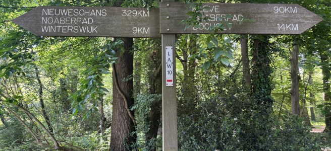 Na twee kilometer over een spannende tocht langs de bedrijvigheid van Winterswijk kom ik op de route, die mij snel brengt bij de Boven Slinge, die hier langs de watermolen Den Helder stroomt. Op het gebouw naast het waterrad staat de olliemöle. Is dit een plaatselijke variant van de naam van de molen? Mijn weg gaat over de rivier en voor het gebouw langs en dan over een smal pad tussen hoge bomen. Een scholier komt op hoge snelheid mijn kant uit. Het gaat net goed. Ik ga langs akkers en door bospercelen. Verharde wegen en onverharde paden. Het is mooi en rustig. Op paaltjes zie ik de markering van het Ludgerpad, ter ere van de Keltische zendeling die naar de lage landen kwam en die in Deventer zijn sporen heeft nagelaten. Helaas, komt het Ludgerpad niet bin Deventer.