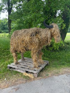 Op mijn weg naar Barlo kom ik over een oud spoortalud. Aan het einde daarvan is een boerderij waar buffels worden gefokt. Gisteren was het ook al buffeltijd. Vlak voor Barlo kom ik langs een immense boerderij, Huis Wehninck, waar van alles op het land wordt gespoten dat een groene nevelige uitstraling heeft. Bij de kerk kom ik opp de kruising in het dorp. De klokken luiden. Aan de overzijde van het kruispunt ga ik zitten op bank tegen de voorgevel van een huis. Naast de voordeur hangt het bordje Welcome. Een gepaste gastvrijheid. Langs de weg naar het zuiden zijn vbeel jonge bomen geplant aan de laan te herstellen. Ten zuiden van Barlo ligt Schloss Diepenbrock, met een heuse gracht er om heen. Het is een waterburcht. Zuidelijker kom ik terecht op de Oude Bocholtse Baan, die ik een tijdje volg. Hier zijn veel fietsers van hoge leeftijd. Ik verlaat deze baan om een bezoek te brengen aan het stadsbos van Bocholt.
