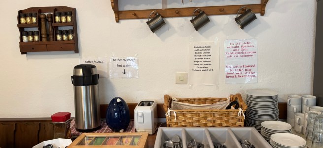 De deur van hotel Schwung waar ik heb overnacht heb ik achter mij dicht gedaan. Buiten is het 10 graden. De zon is onzichtbaar. Om 7 uur klonk de wekker en voor achten zocht ik mijn weg naar de ontbijtzaal waar niemand aanwezig was. Wel stond er ontbijt klaar, verdeeld over 2 tafels en een koelkast. Nog tijdens mijn ontbijt kreeg ik gezelschap, in een verre hoek van de ontbijtzaal.