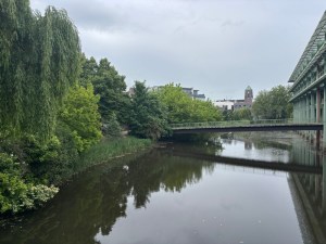 Buiten loop ik langs twee middelbare scholen (beiden een gymnasium). Voor de gebouwen staan veel fietsen die klaar zijn om mee door de bossen te scheuren. Ik loop dwars door het centrum heen, dwars door de donderdagmarkt met veel planten, langs het oude stadhuis en ik kom uit bij de Bocholtse Aa, de rivier die dwars door de stad stroomt. Vandaag zie ik meer eetgelegenheden dan ik gisteren zag. Blijkbaar zocht ik in het verkeerde deel van de binnenstad.