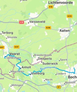Na mijn pauze ga ik verder om met een omweg uit te komen in Gendringen. Ik wijk even van de route af om naar de joodse begraafplaats van Anholt te gaan. De laatste begrafenis vond plaats in 1933. Ik zoek de route weer op en kom bij de grens met Nederland die ik een tijdje volg, langs de Krummer Bach. Dan loop ik mis waar ik met een andere wandeling hier ook mis ben gelopen. Gelukkig ben ik geen ezel, want die stoot zich in ‘t gemeen niet tweemaal aan dezelfde steen. Rechts ligt een golfbaan, een man draait weg van zijn medespelers. Zijn handen vormen een beschutting voor een sigaret en een brandende lucifer. Er komt witte rook uit zijn handen terwijl de eerste druppels uit de hemel vallen. Gelukkig blijft het bij de eerste druppels. Langs het oude Openluchttheater, door een recreatiegebied (met een blote-voeten-pad) van Engbergen. Bij de Engbergseweg en de Oude IJssel ga ik van de route af en loop Gendringen binnen door het Kernspark. In het centrum zoek ik naar een eetgelegenheid. Die vind ik bij MoTTo aan de Grotestraat, een bijzonder restaurant met vintage aankleding en nog meer aangenaams. Zéér de moeite waard en ik heb er een heerlijke aspergesoep gegeten. Nog even naar de Coop (binnenkort PLUS), waar mijn rugzak de winkel niet in mag. Dan op weg naar mijn gastadres waar ik hartelijk wordt ontvangen met thee en eigen baksel en de weg wordt gewezen naar slaapkamer, badkamer (inclusief toilet) en een rustige nacht.