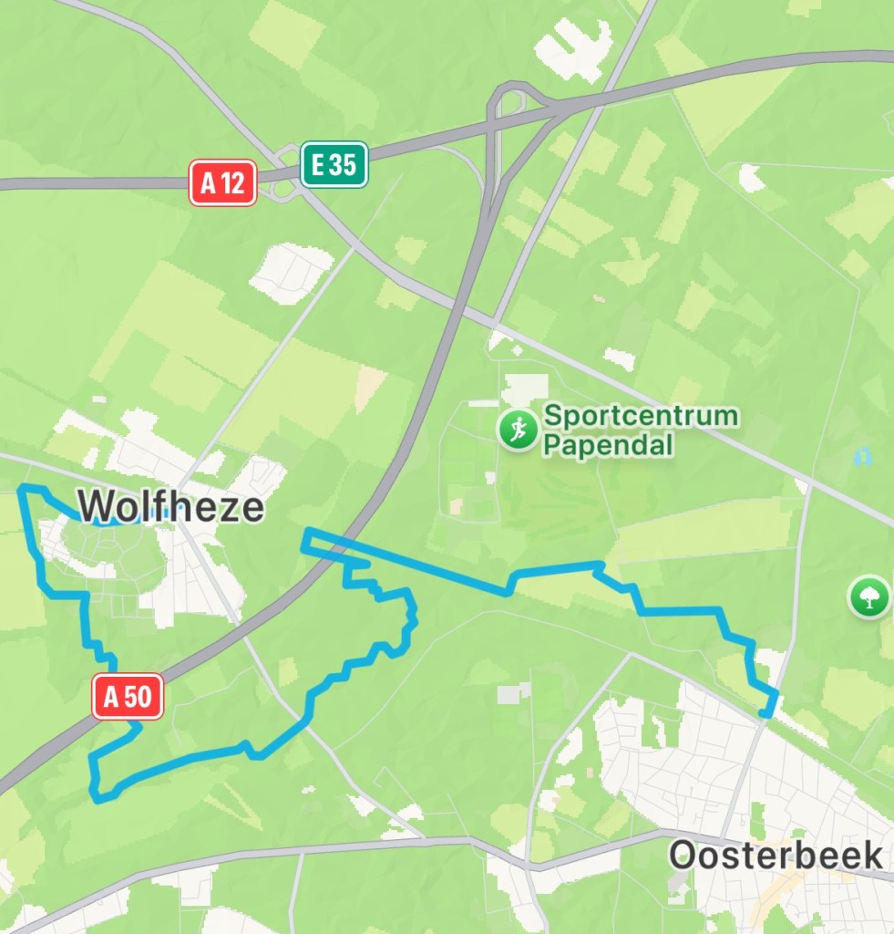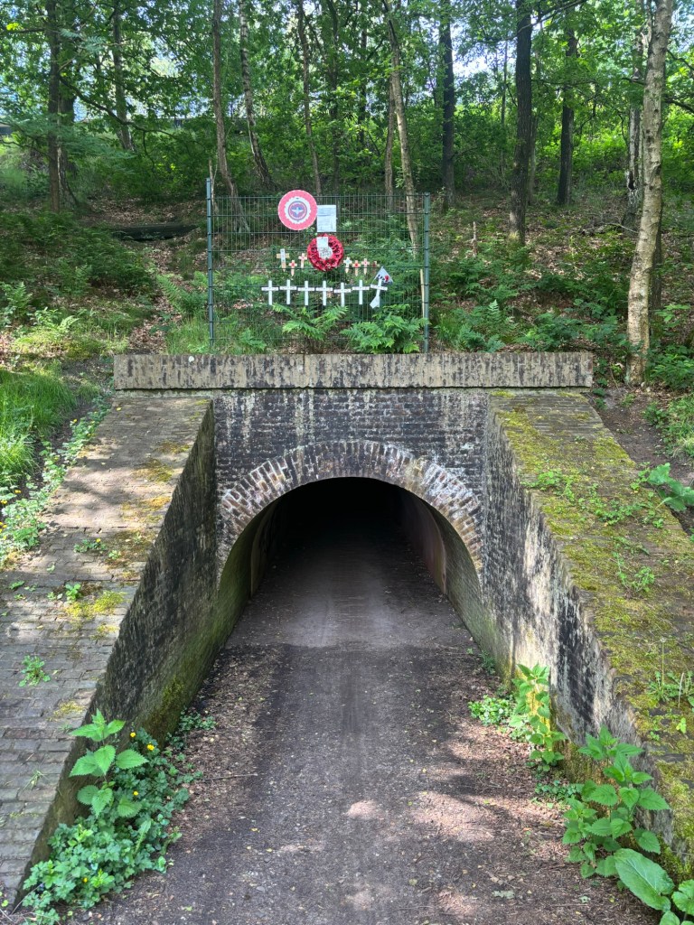 Vlak voor de bebouwing van Wolfheze kom ik bij een duiker onder de spoorlijn door. Meestal is een duiker klein en laag om het water door te laten. Deze duiker is de grootste op het traject van de spoorlijn van Utrecht naar Arnhem. Zo groot dat ik, enigszins gebukt, er door kan lopen. Van de andere kant komt een gezin met fietsen wandelend mijn kant op. Ik roep ‘boe’ en van de andere kant hoor ik de moeder roepen ‘niet doen, papa!’ Blijkbaar jaag ik kinderen de stuipen op het lijf. Ik groet de vader die voorop gaat met één kind met ‘dag papa’. Hij kan er wel om lachen, zo ook de moeder die de rij sluit. Tijdens de campagne Market Garden reden op 19 september Poolse en Britse troepen met jeeps door deze duiker. Boven mijn beginkant van de duiker zijn de restanten van de herdenkingen te zien. Voorlopig ga ik de bebouwing van Wolfheze niet in. Eerst weer de A50 kruisen en dan door de prachtige Wolfhezerbossen, met diep ingesleten en gegraven sprengen met bruggetjes en oude bomen. Langs een duizendjaar oude eik die lang geen duizend jaar is en dat ook nooit gaat halen. Vervolgens langs een gesloten Fletcher Hotel (op de website staat dat het hotel volledig verhuurd is. De huurder blijkt het COA te zijn). Aan de overkant van de weg gaat de wandeling verder langs waterwegen en omgevallen bomen en Wodans eiken. Altijd interressant voor de vele schilders die in de vorige eeuw in Oosterbeek woonden en werkten. Langs de Wolfhezerheide waar paden zijn afgesloten voor de wandelaar om het gebied meer rust te geven. Over een andere heide, met grafheuvels. Hier komt wat meer wandelvolk op mijn pad. Wanneer ik de wildwissel over de A50 overga kom ik zelfs vier flink bepakte mannen en vrouwen tegen die niet bezig zijn met een ééndaagse wandeling.