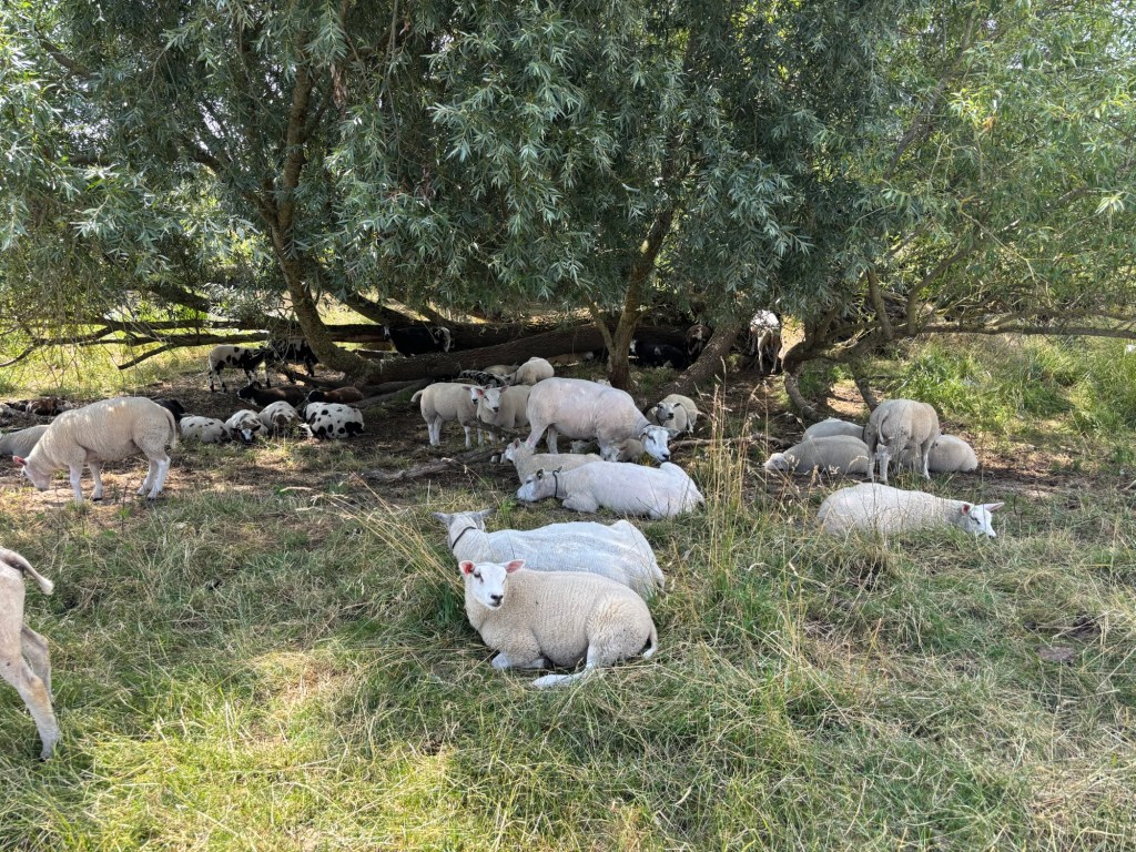 We ontworstelen ons eerst aan de aantrekkingskracht van Culemborg. Door een groenstrook langs de Parklaan. Dan hangen wij de vlag uit voor de Oranje Nassaulaan. Vervolgens langs de Plantage. Dan de Algemene Begraafplaats waar het nog rustig is. Onder aan de Beusichemsedijk lopen wij door het versgemaaide gras, dan net geschud is door een trekker met schudder. De zon schijnt uitbundig. Het door de trekker en schudder opgeworpen stof dwarrelt zonder patroon tussen de zonnestralen door. Bij de haven worden wij welkom geheten door een man die een tas vol taartdozen heeft. We pogen te delen in de feestvreugde, maar we zijn te vroeg. Wanneer jullie later terugkomen is er wellicht iets over, zegt de taartdrager, die zijn weg vervolgt naar het clubhuis van de watersportverenging De Helling. Een uitgelaten menigte zit op het balkon van de helling. We zetten ons over onze teleurstelling heen en gaan naar de Veerweg. Het veer is nog niet weg, sterker nog het veer ligt nog klaar voor ons. Met een kleine tussensprint komen we juist op tijd op de voor- of achterplecht. We steken de provinciegrens over. De overzijde komt in zicht. Daar wachten mensen te voet en te fiets. Aan de overzijde ontdekken wij een overzichtskaart van de wandelknooppunten van hier tot Schalkwijk en naar oost en west. Mijn wandelgenoot (wiskundige!) gaat voor de methode van onthouden van enkele getallen van knooppunten. Ik ga voor een foto van de kaart. Wanneer wij al even op weg zijn naar nummer (48) kom ik op een briljante gedachte! Op mijn TopoGPS kaart heb ik ook de wandelknooppunten staan. Geheugentraining, niet nodig. Foto, niet nodig. We struinen door Steenwaard. Bij een immense bramenstruik zijn twee dames druk bezig om bramen te plukken. Eén heeft het bakje waar eerder op de dag boterkoek inzat in gebruik als reservoir voor bramen. Voor een korte wijle voegen wij ons bij de dames, zonder echter een voorraad aan te leggen in welk bakje dan ook. De zon schijnt uitbundig in de uiterwaarden. Schapen rusten uit in de schaduw. Op andere plekken is nog te zien dat daar schapen schuilden vanwege de restanten schapenwol in de laaghangende struiken. Even verderop doen ook wij schaapachtig en gaan even zitten in de schaduw met zicht op de Lek. De zon schijnt steeds feller. We praten over de knooppunten en boeken, gelezen en ongelezen, en Leo Vroman. Dan gaan we verder, langs de aanlegsteiger van Liniepontje. Dit pontje verbindt forten via de wateren. Wij gaan door naar (48). Daar treffen wij een medewerker van het waterschap aan. Hij wijst ons op het verschil in waterpeil aan de ene kant van het pad en de andere kant. Hij heeft iets gedaan waardoor het het waterpeil aan de ene kant daalt en aan de andere steigt. Het water stroomt met kracht uit een ondergrondse buis. De man trekt zijn werkkleding uit, loopt naar het hek en levert zijn eigen bijdrage aan de stijging van het plaatselijke waterpeil. Wij gaan door de uiterwaarden (of is het hier een enkelvoud?) naar nummer (47).