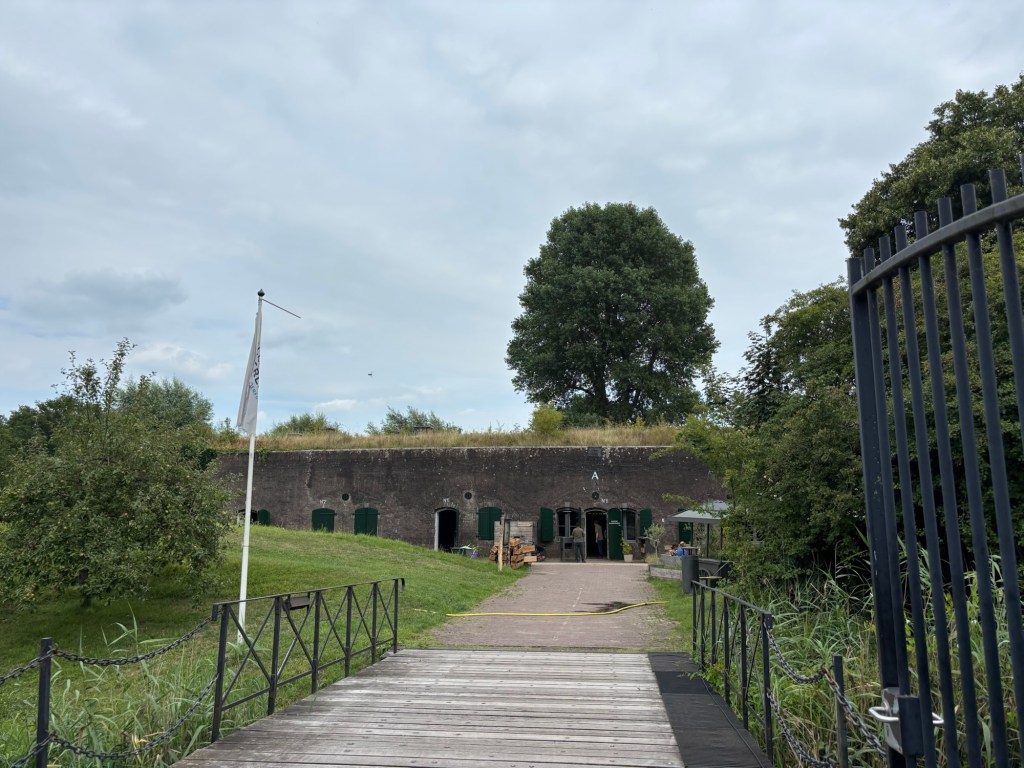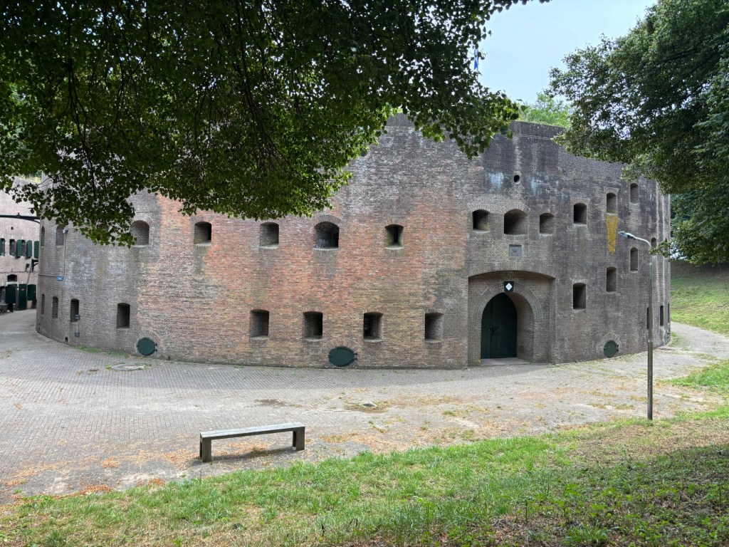We lopen over een schaduwrijk pad met aan onze linkerhand het Inundatiekanaal. Dit kanaal komt uit bij Fort Werk aan de Korte Uitweg. De naamgever van de forten in deze omgeving heeft zijn/haar uiterste best gedaan. Wij denken na en spreken over onze kortste uitweg. We besluiten om deze keer niet naar Schalkwijk te gaan. Er is een mededeling dat vanwege werkzaamheden het pad van het Klompenpad niet beschikbaar is. We besluiten om onszelf te parkeren op het Fort. Even geen Werk. We lopen de houten brug over en worden uitbundig welkom geheten door één van de vrijwilligers. Hij chauffeurt ons naar de juiste plek voor een bete brood en een slok drinken. Minstens één Michelinster, betoogt hij. We gaan het zien. In een voormalige schiettent en voormalige poffertjeskraam huist nu een voedselkraam die van vele gemakken is voorzien. We geven onze bestelling door en kunnen ergens gaan plaatsnemen. Even later wordt onze bestelling luidkeels omgeroepen, zonder versterkers. De vrijwilliger komt vanmiddag met verhalen hoe de snelweg is verdwenen. Wandelaars en fietsers hebben een pauzeplek gevonden op deze rustige plek. Wat zeg ik? Rustig? Vlakbij ons tafeltje zet een man een grasmaaier aan en laat de motor goed ronken. Langzaam rijdt hij bij ons weg. Ook voor ons is de tijd gekomen om weg te gaan. Na nog een blik op de knooppunten weten we wat wij gaan doen. We lopen terug naar (6) en dan gaan we het open veld in. Hij schijnt dat het werk aan het pad is afgerond. We lopen door het inundatiegebied, maar daar is op dit moment niet veel van te merken. Het gebied wordt ook gebruikt als waterberging. Iets daarvan zien we wanneer wij op de Achterdijk wandelen, waar toch iets meer verkeer is dan wij hadden voorzien. De Achterdijk is een lange weg met her en der een schaduwrijke boom die onze kant op valt (de schaduw, niet de boom). We gaan naar het zuiden en lopen over het mooie terrein van Werk aan de Groeneweg. Aan het einde van dit Werk zijn we bijna op bekend terrein. We volgen onze weg door de uiterwaarden. Bij de aanlegsteiger van het Liniepontje gaan we op een passend bankje zitten. Zojuist zagen we aantal bepakte fietsen en fietsers de pont afgaan en de richting Culemborg inslaan. Die zullen zo wel terugkomen, verwachten wij. Er zijn een paar overstapjes en grote hekken. Niet gemakkelijk voor bepakte fietsen en fietsers. We zien echter de fietsers niet meer terug. Verdwenen in de uiterwaarden. Wanneer we terug zijn bij (63) ligt de veerpont net afgemeerd en wij nemen een sprintje (rekening houdend met onze leeftijden) en we komen op tijd op de pont. Aan de overzijde wacht een moeder en kind op de zwaaiende man en vader op de pont. In een bocht van de Veerweg staat Vrijbuiter, een pipowagen (of heet dat tegenwoordig ook al foodtruck) met ijs en koffie en nog zo wat. We nemen pauze op deze plek met zicht op de jachthaven en de de Lek. Na deze versterking gaan we door het oude centrum van Culemborg. Mijn wandelgenoot wordt meermaals gegroet en aangesproken door jong en oud. Blijkbaar is hij een Bekende Culemborger (BC’er). Zo keren wij huiswaarts. Gesterkt door de Forten.