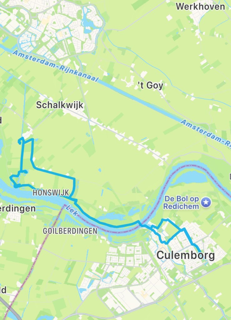 we wandelen vanaf de buitendeur naar de veerpont die de oever van Culemborg verbindt met de andere oever, door de Lek over te steken. Vandaar verwachten wij Schalkwijk te bereiken en dan de weg huiswaarts in te slaan. Tot zover het plan.