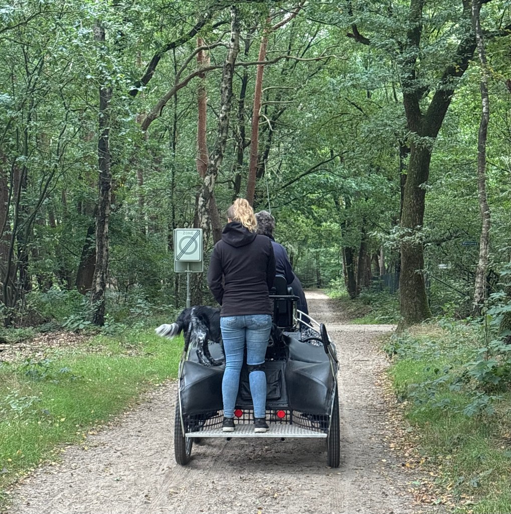 Na mijn lunch ga ik verder naar het zuiden, langs grafheuvels en een omheinde speelplaats in het groen. Op de parkeerplaats staan dure auto’s uit Nederland, België en Spanje. Het Spaanse gezin is net op weg naar het Spaans gekentekende automobiel. Mijn weg gaat verder naar het zuiden tot ik bij Landgoed Schovenhorst kom. Ik kom langs het Arboretum, maar er is ook een Pinetum. Een landhuis met carillion aan de muur, ter nagedachtenis aan Roelof-Jan van Benthem. Aan de overkant van de Garderenseweg is nog een uitgebreide bomenverzameling (Josinapark), keurig netjes van kleine bordjes met nuttige informatie voorzien. Hier sta ik oog in oog met de Zakdoekjesboom. In totaal telt dit landgoed vijf bomentuinen. Even verderop wijk ik van de route af om te kijken bij de uitzichttoren die indrukwekkend creatief de hoogte ingaat. Er is een soort pinautomaat waar je kaartjes kan kopen, en wanneer het apparaat niet werkt kun je ergens anders je kaartje bekomen. Dan kom ik tweemaal het bordje Het Gat buurtschap tegen. Tussen deze twee bordjes staan twee imposante huizen, daarnaast een oud huis dat te koop staat. Of er veel buurkinderen zijn om mee te spelen, weet ik niet. De Drosteweg gaat door en door, af en toe onderbroken door paard en wagen en een enkele losse amazone. Na 15 kilometer op de route ben ik op Bato’s weg. Het is één uur. Tijd om te bellen om een haltetaxi te regelen die mij kan oppikken bij een bushalte in Huinen. Geregeld!, om kwart over twee zal daar een taxi van RRReis verschijnen. Nu kan ik mij richten op de Krachtighuizerweg die mij nog verder naar het zuiden zal brengen. Dan door het bos naar de Poolseweg en een paar meter verder naar het zuiden en dan houdt de route op. Ik neem de kortste route naar de rotonde op de N303. Ik ben ruim op tijd en neem plaats in een klein bushokje.