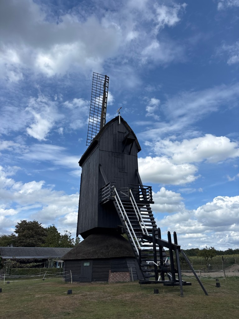 Het wordt tijd om de Heuvelseweg in te slaan en de bebouwde kom van Lunteren achter mij te laten. Hier is er akkerland enh weiland en maisland. Af en toe schemert een camping tussen het groen door. Ook op de Zeckersteeg spoeden mensen zich op de fiets verkleed naar het centrum van Leusden. De Fransesteeg brengt mij door het Doesburgerveen. Dan kom ik uit op de bekende Lunterseweg, tussen Lunteren en Ede (of preciezer Kernhem). Over zanderige wegen ga ik naar De Doesburg, een buurtschap. Bij een zitbankje wordt vriendelijk edoch dringend gevraagd om de eigen troep mee te nemen en niet achter de bank te gooien. Ook is men er niet van gediend dat honden hier worden geborsteld. Verder is het een leuke plek om te zitten, wat ik dan ook niet doe. Ik zie de beroemde Doesburgermolen. In een ver verleden lieten wij hier een paar trouwfotos maken. Een molen is fotogeniek. Hier is het stil. Een ieder zal nu in Lunteren zijn. Bij de molen is zelfs een Haltetaxi van RRReis. Zo kunnen molenliefhebbers hier goed terecht komen met het openbaar vervoer.