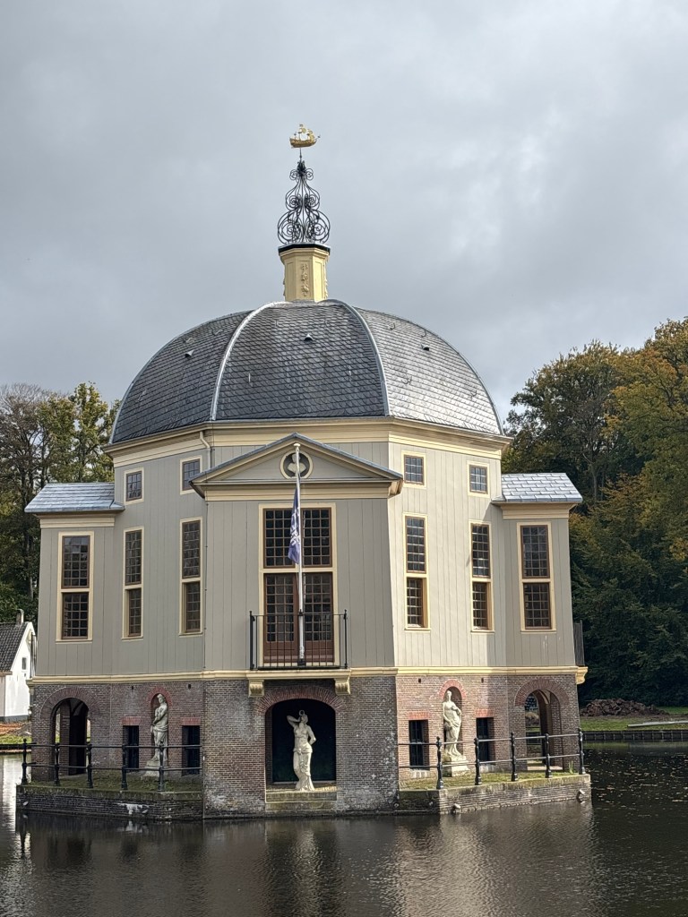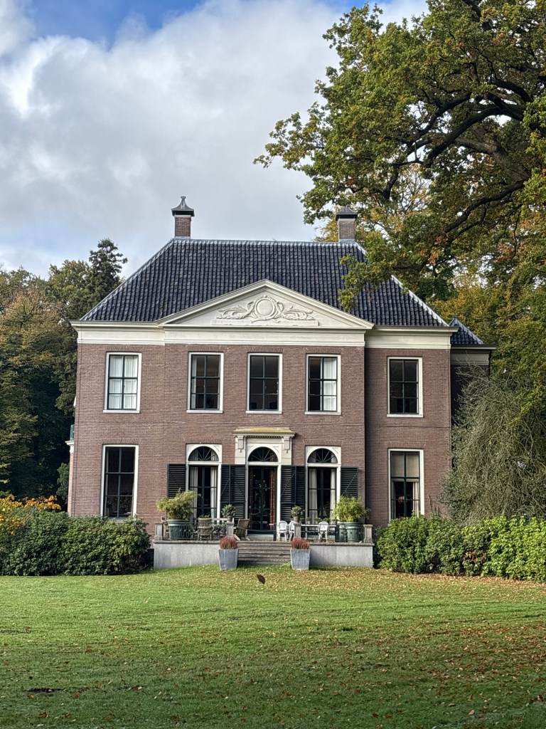 Al gauw krijg ik iets te zien. Aan mijn rechterhand doemt buitenplaats Trompenburgh op. Het hoofdgebouw ligt in het water, daarbuiten liggen percelen waar nog een enkele boom overeind staat. Dikke boomstammen zijn geveld en in mootjes gezaagd. Gelukkig klinkt er op dit moment geen enkele kettingzaag. Binnen en buiten Trompenburgh wordt sinds 2020 gewerkt aan een restauratie om het zo veel mogelijk terug te brengen tot de staat van de 17e eeuw. Misschien kunnen de restaurateurs nog een paar interieurstoffen bij de buren bestellen. De naam van het landgoed is afgeleid van de beroemde zeevader Cornelis Tromp, zoon van de wellicht nog beroemder Maerten Harpertsz. Tromp. Hij woonde hier met zijn vrouw Margaretha van Raephorst. In het jaar 1672 steken de Franse troepen het oorspronkelijke gebouw in brand. In de jaren werd het huidige gebouw gebouwd.