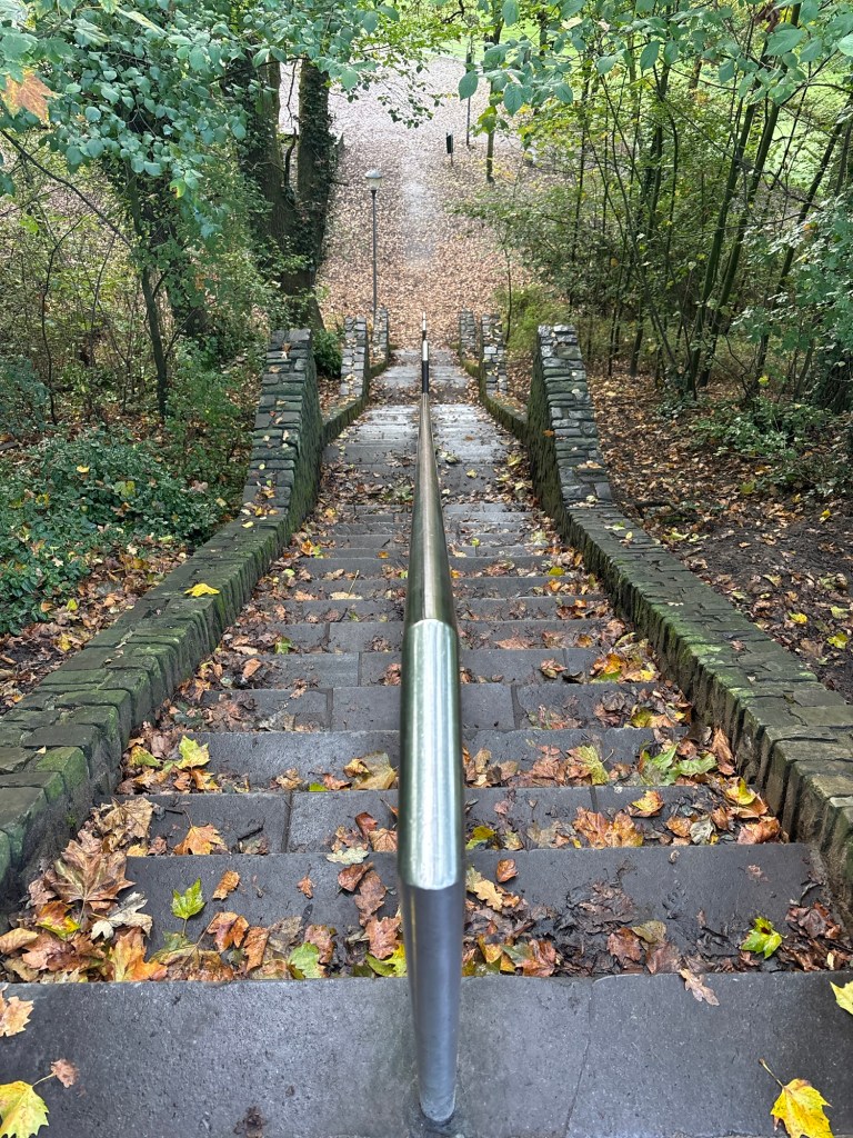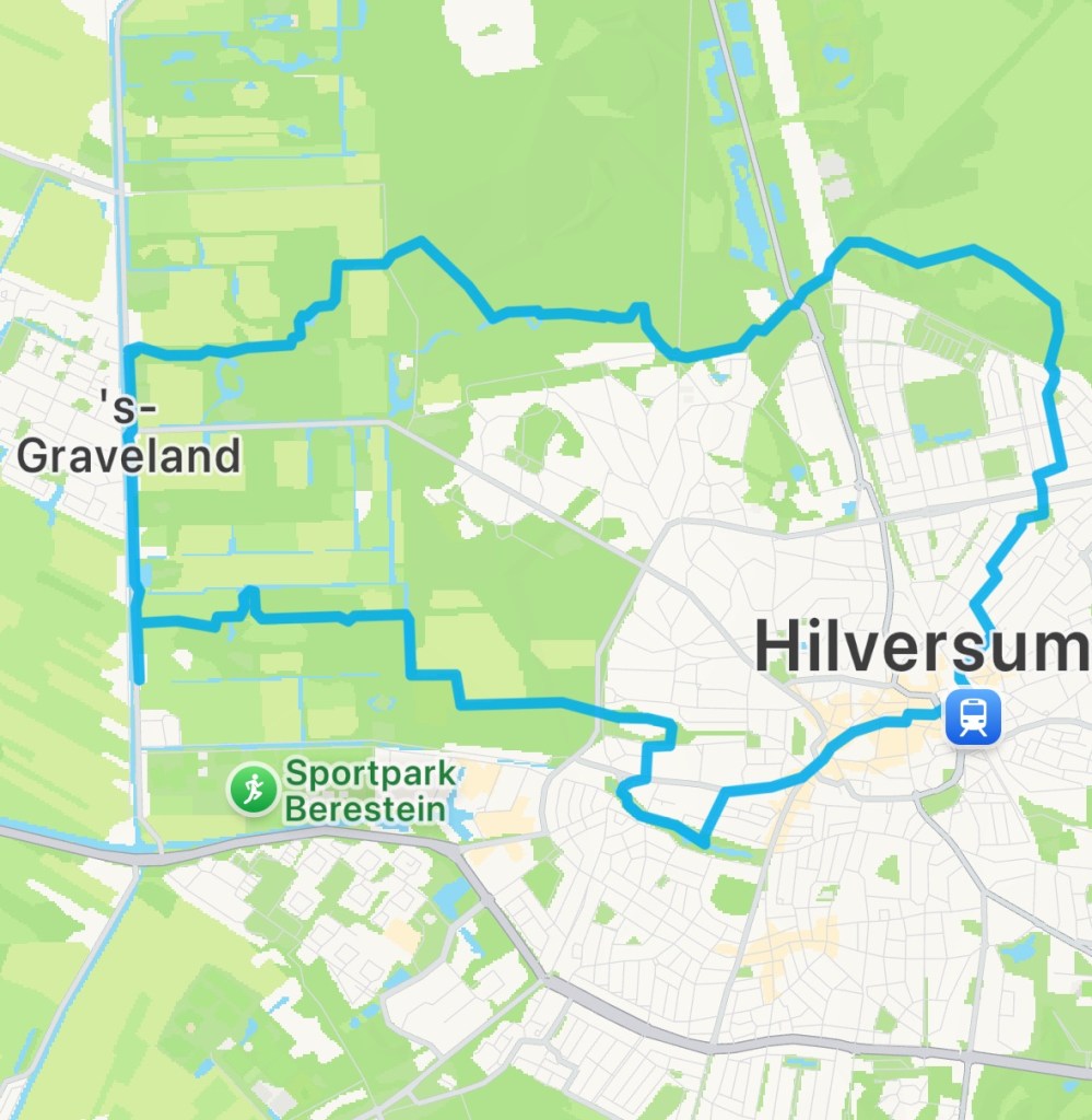 Even voorbij het kerkgebouw van de Hervormde Gemeente ‘s-Graveland ga ik bij de Kerkvaart rechtsaf en door een bosgebied. Ik kom uit in het Spanderswoud, dat toebehoort aan het Goois natuurreservaat. Nu kan ik een tijd door de bossen lopen en over de herfstbladeren die het gevecht met de zwaartekracht hebben verloren. Ik kom uit bij De Boshut, een alleraardigst plekje om even te pauzeren. Alsof ik even terug bent gewandeld in de tijd. Ik ga binnen zitten en bestel een soep. Het wordt de vegetarische groentensoep, die gloeiend heet wordt opgediend. Ik heb gelukkig geen haast. Het is een komen en gaan van mensen die aan zijn komen fietsen of wandelen. Alles op gemoedelijke wijze. Opgewarmd door de soep ga ik verder, langs het Mediapark en dan een mooi gedeelte over de Westerheide. Dan de bebouwing van Hilversum met een grote verscheidenheid aan bebouwing, de straatjes van de Geuzenbuurt (met meerdere minibiebs). Dan kom ik bij een ingang van het station die vanmorgen nog de verkeerde kant was. Nu is het goede kant.