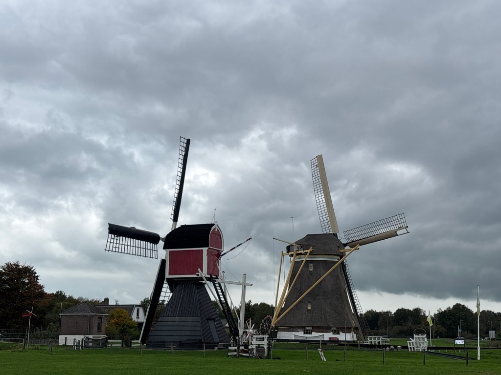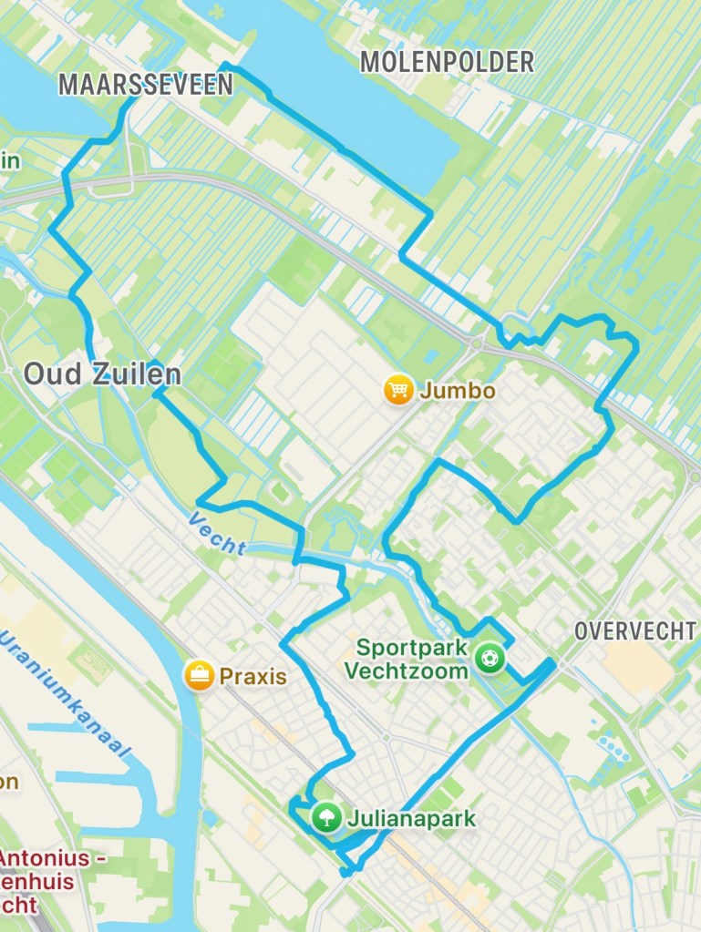 Na mijn pauze loop ik over het Tournooiveld naar de Vecht. Dan naar de brug die net aan het dichtgaan is en vervolgens over een smal paadje tussen huizen en de Vecht. Dan ga ik over het Kerkhoflaantje en ik kom uit op de Groeneweg die ik linksaf op ga en dan passeer ik de oude begraafplaats. Ik zie daar de beide prachtige molens al. Molen van de Polder Buitenweg en molen van de Polder Westbroek. Wieken tastend naar de donkere luchten. Ik ga onder de Zuilense Ring door en kom uit bij de Kleine Plas om uiteindelijk uit te komen bij, ja, zeg het maar…, de Grote Plas. Het is een grote recreatieplas. Het parkeerterrein is bijna verlaten. Bij horecagelegenheden wapperen vlaggen. Bij de Zuidhoek ga ik naar de Gageldijk, een rechte dijk die uitkomt bij Fort Gagel. Ook daar horeca. De route gaat een eindje door de Ruigenhoek en dan volgt een brug voor voetgangers en fietsers over de Karl Marxdreef. Ik ben aangekomen in Overvecht en wel in het Sjanghaipark. Op een bankje zitten een paar jongelui, een meisje hangt over een fiets, een ander meisje zit op een fatbike. Op het moment dat ik langskom steekt dit meisje haar beide armen omhoog en een juichkreet klinkt. Ik heb een 8,6 gehaald, roept zij. Het is een cijfer dat voor haar examen meetelt. Zij hoopt door te gaan naar het MBO en dan door om uiteindelijk via de PABO voor de klas te gaan staan. De andere jongelui zijn al even enthousiast. Met een groet op mijn lippen loop ik verder door het groen om bij de Carnegiedreef rechtsaf te slaan om uiteindelijk bij een water uit te komen. Het is de Klopvaart Deze vaart volg ik naar het zuiden totdat ik bij de Vecht uitkomen. Door het groen ga ik verder totdat ik uitkom bij de Einsteindreef. In het verlengde van deze Dreef ligt de Marnixdreef en die volg ik en volg ik en volg ik totdat ik uitkom bij de laan van de heilige Jozef en dan ligt daar in de hoogte het station van Zuilen. Mijn tocht zit er op.