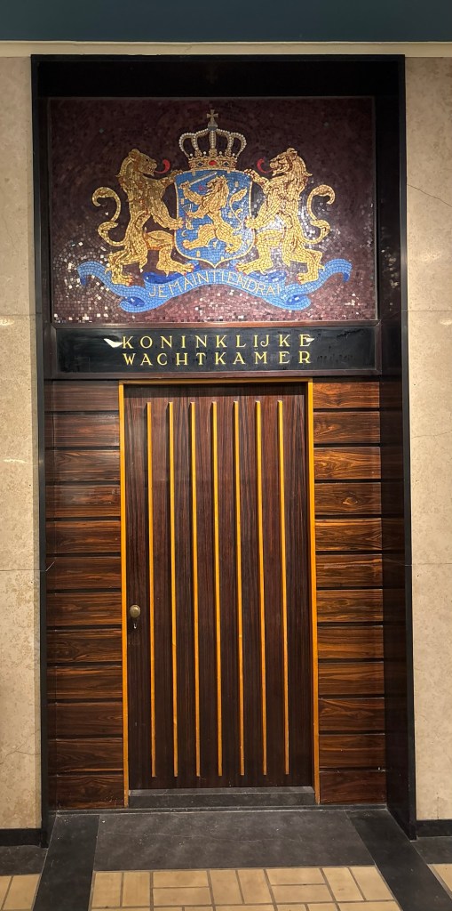 We gaan langs Heidebloem en over de Postweg en dan gaan we naar Theehuis ’t Bluk. Bluk is de lokale uitspraak van Blok. Op het blok werd door arme mensen die hout sprokkelden op de Zuiderheid in hanteerbare porties gehakt. Ik neem aan dat zij niet voldoende geld hadden om in welk theehuis dan ook een stoel te bezetten en te eten en te drinken. Het is hier gezellig, en dat al sinds 1937. Daar het dreigt te gaan regenen kunnen we binnen zitten in de ruimte waar alles al is gereserveerd. Aangezien we niet heel lang zullen blijven kunnen we toch gaan zitten. Opvallend is dat langzamerhand blijkt dat hier voornamelijk vrouwen verblijven. Maar dat zegt uiteraard niets over het geluidsvolume dat zich binnen ontwikkelt. Kroketten op brood en een biologische pompoensoep gaan er goed in. We laten ons zelfs niet van de wijs brengen door een vallend vol dienblad. We gaan weer op pad. Genoeg gezeten en gerust. Of het regent of niet, het is goed om op pad te zijn. Vlak bij een begraafplaats gaan we een provinciale weg onderdoor en zien dan La Place, maar om nu weer te pauzeren is zelfs aan ons te veel gevraagd. We ondersteunen graag de plaatselijke horeca, maar er zijn soms grenzen. We gaan de weidsheid van de Westerheide op. We zien van dichtbij een schaapskudde die zich verspreid heeft over een groot gebied. Er lopen ook zwarte schapen bij, die toch opgenomen zijn in de groep. Dan komen we bij een onopvallende wildwissel over het spoor en over de Naarderweg. Het valt niet op dat dit onder je voeten plaatsvindt. De natuurbrug Zanderij Crailoo is zó breed en zó lang (800 meter!). Koningin Beatrix heeft deze brug in mei 2006 geopend. We gaan verder door bossen en over heidevelden. We arriveren bij station Bussum-Zuid. Weer een etappe van de Traagste Tocht gewandeld. Op het perron raak ik aan de praat met een licht aangeschoten man, zijn hondje is nuchter. Op station Baarn stappen we uit. We besluiten om nog even een blik te werpen op de deur van de Koninklijke Wachtkamer. Daarna gaan we naar de huiskamer van het station, waar een enthousiaste medewerker ons wegwijs maakt in Koninklijke Wachtkamers nadat hij ons heeft voorzien van een natje en een droogje.