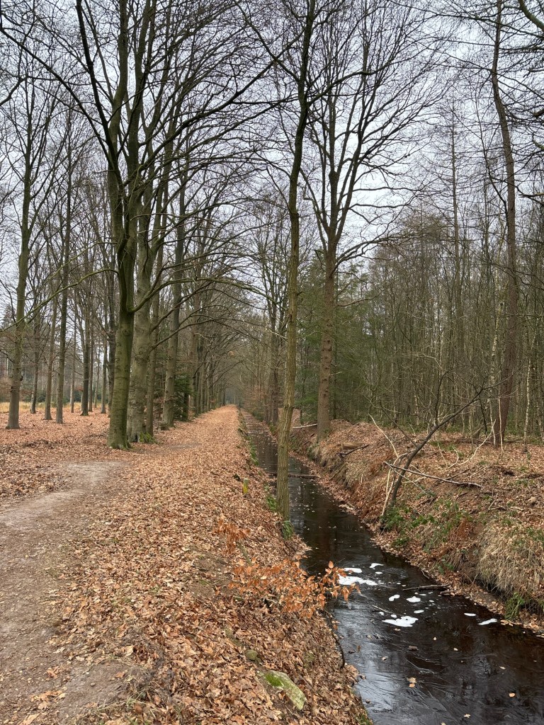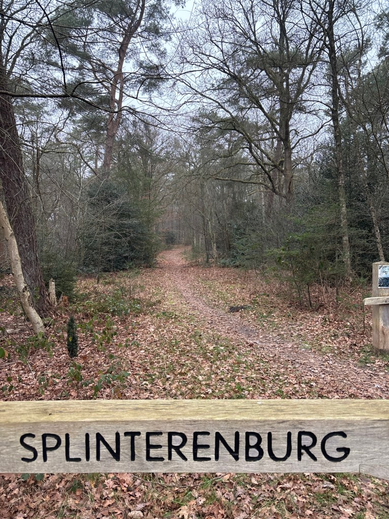 Nadat ik ben uitgestapt op deze zaterdagmorgen wandel ik van station Den Dolder naar het noorden. Links van mij zie ik de inrit van de sauzen van Nederland: Remia. Op deze plek is een lange industriële geschiedenis. Even verderop is aan mijn rechterhand een ingang voor fietsers en wandelaars naar Altrecht en Reinaerde. Ook zorginstellingen hebben een geschiedenis in Den Dolder. Inmiddels ben ik overgestoken en passeer de Maria Christinakerk. Komend jaar (2026) zal de pastorie van deze protestantse gemeente worden verkocht en voor het kerkgebouw zijn ook verkoopplannen. Aan het einde van de bebouwing aan mijn linkerhand ga ik het Pleinesbos in. In dit bos van het Utrechts landschap zijn fietsen en paarden en honden niet gewenst. Opvallend. Het is dan ook heel stil op de lange laan die ik betreed. De stilte van een zaterdagmorgen. Ik kom uit bij de N234 en loop langs restaurant Le Nord (met een Franse keuken ?). Terhoogte van de Soestdijkseweg Noord steek ik de Provincialeweg over. Aan de andere zijde kom ik bij een ingang van Landgoed Splinterenburg. Om mijn wankele geheugen te helpen maakt ik een foto van de dwarsligger over het pad. Op dat moment komt een man met muts en met hond aanlopen uit het bos.