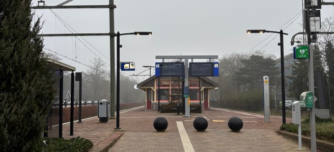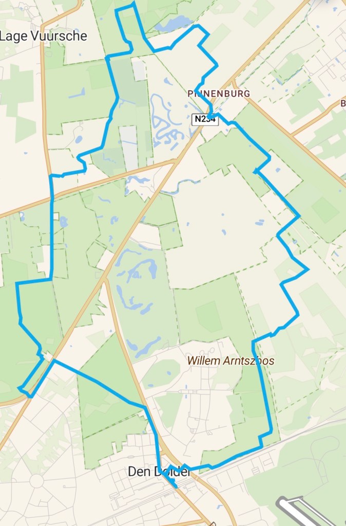 Nu even goed uitkijken want ik ga een drukke weg oversteken, bij twee tankstations. Weer een N-weg, zonder kleerscheuren kom ik uit aan de overkant. Restaurant ’t Spiehuis schijnt definitief de deuren te hebben gesloten. Alleen de parkeerplaats is nog open. Ik ga nu Op Hees van Natuurmonumenten in. De bordjes aan het begin zijn wat verwarrend. Op het bord van Natuurmonumenten staat dat fietsers alleen op de hoofdlaan mogen fietsen. Op de paal waar dit bord aan is bevestigd is een bordje dat betekent Verboden voor fietsers. De weg verwijst nog naar het landgoed Pijnenburg dat hier ook ruimschoots aanwezig. Het ene na het andere bosperceel behoort nog tot Landgoed Pijnenburg (van de familie Insinger). Ook zie ik een bordje van de verzekeraar a s r dat hier boscomplex Hees in bezit heeft. Net na 13 kilometer merk ik dat een pad is afgesloten door takken van klein tot groot die over het pad zijn gedistribueerd. Ik slaag er in om mijn weg te vervolgen. Het is bos en bos en bos totdat ik vlakbij de spoorlijn uit kom. Dan volg ik het spoor en kom terecht op het terrein van de Willem Arntszhoeve. Dan is het nog even en dan ben ik terug op station Den Dolder. Over een paar minuten komt de trein die mij verder zal brengen.